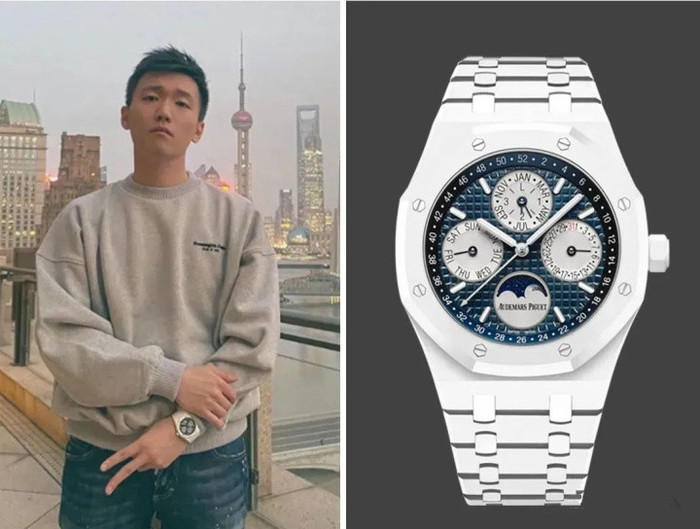 在国米的签约仪式上 佩戴了一枚价值78万人民币的百达翡丽世界时铂金腕表。表盘中央采用了独特的珐琅漆工艺,制作出的地球各大洲景象。入手这块老派型腕表,由此可见,张康阳是一位有品位的人。