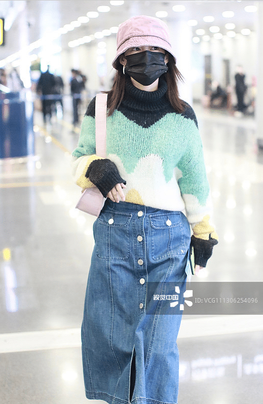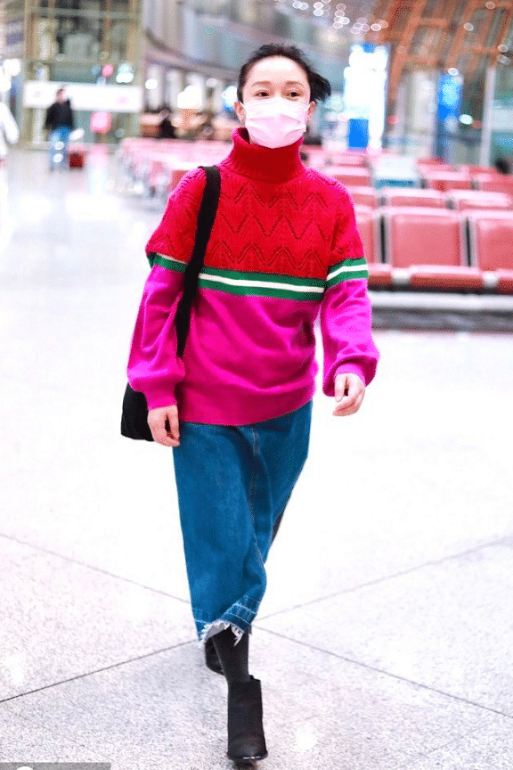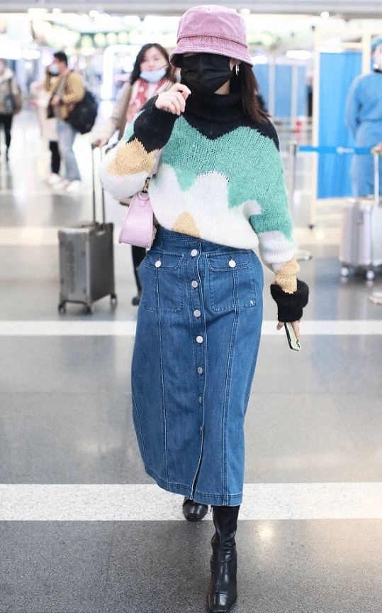 女星周迅近日的机场look也是和李沁同样的搭配思路,彩色的毛衣搭配上牛仔半裙,撞色拼接的彩色毛衣真的很亮眼了,搭配上蓝色牛仔裙得到了很好的中和,牛仔色和各种彩色都可以轻松的搭配。