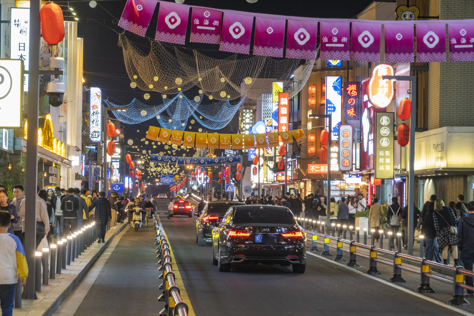 因为街道场景太像日本,大家干脆把淮海街叫“日本街”。与我们常见的城市步行街所不同的是,这里还不单纯是一条步行街,因为街道中间有机动车道,城市色彩浓郁。