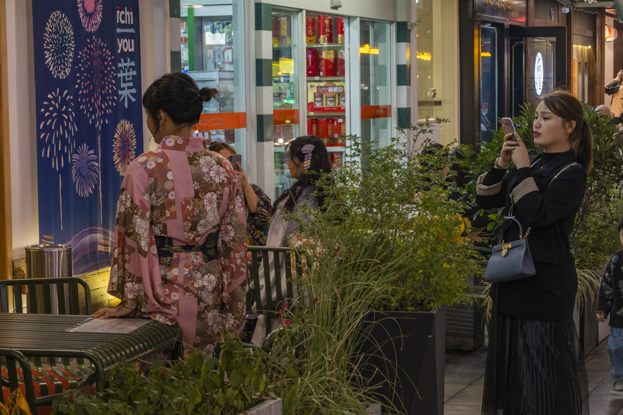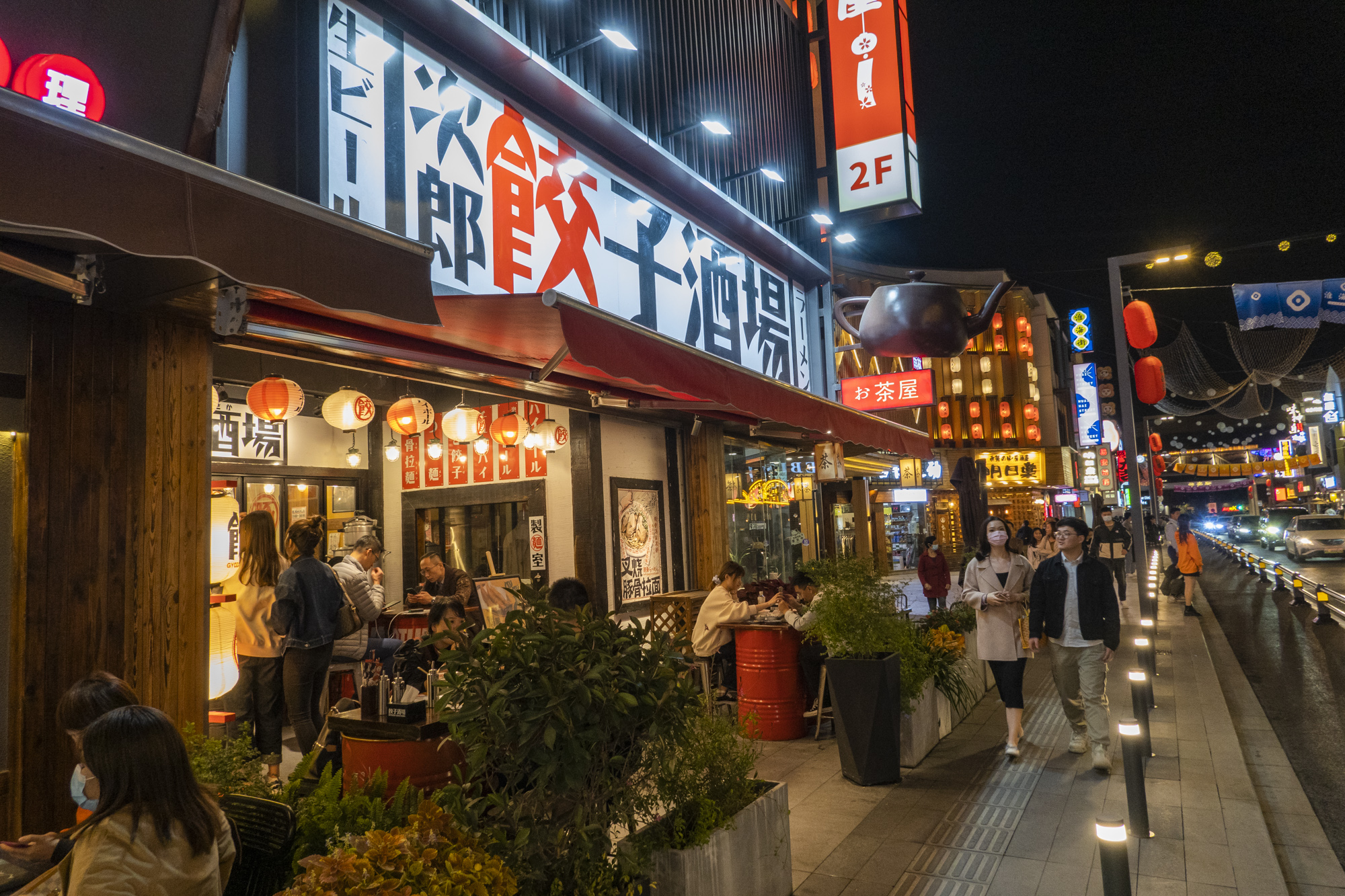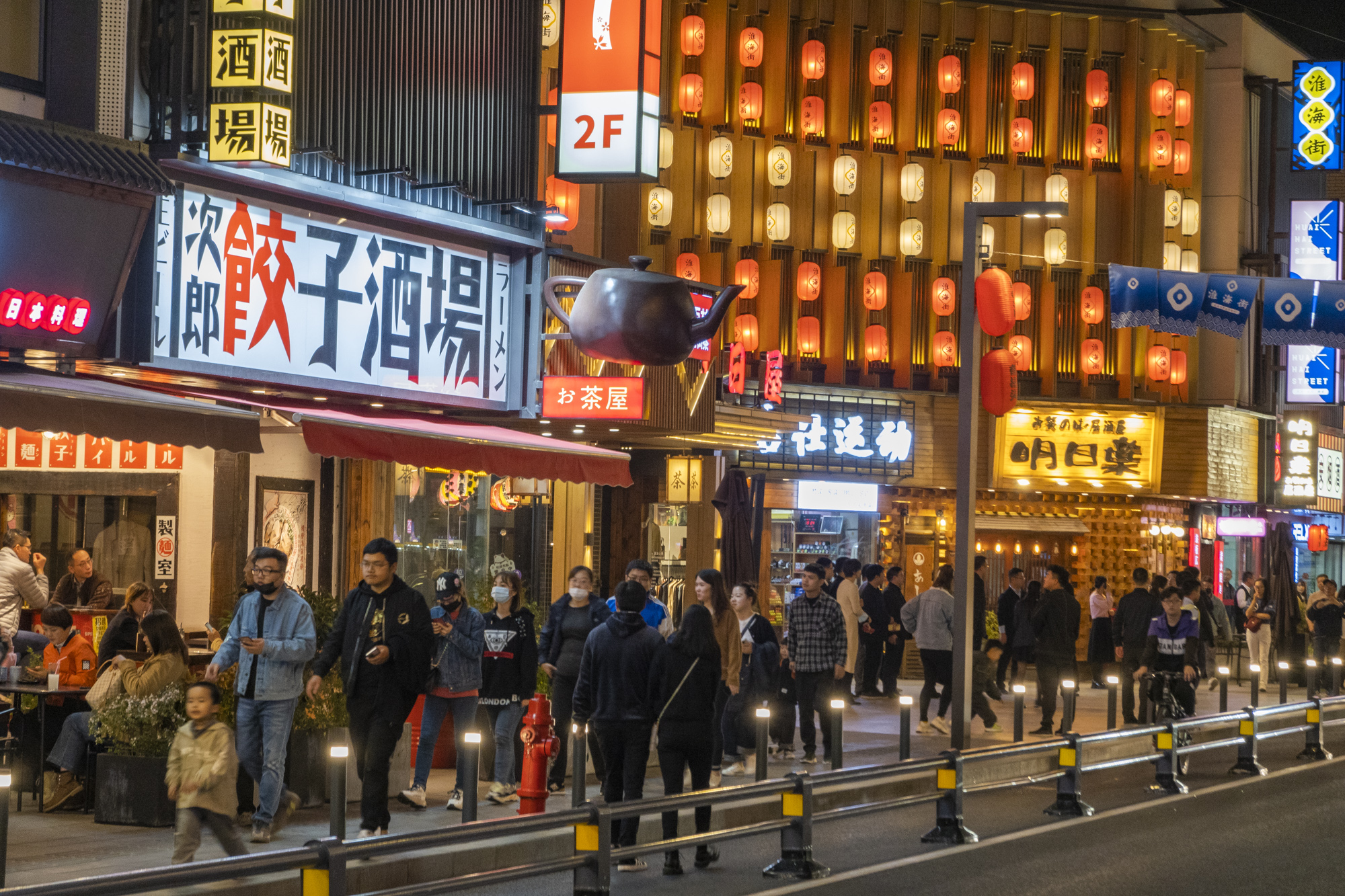 我在淮海街上走这一路,街道两旁拍照的人络绎不绝。女孩子们还特地穿上了和服来此拍照,眼前的场景,真真感觉是到了日本街头。这里一跃成为场景鲜明的“小东京”,不出国就能穿越到“大阪街头”,再造了全新的城市微度假地标。