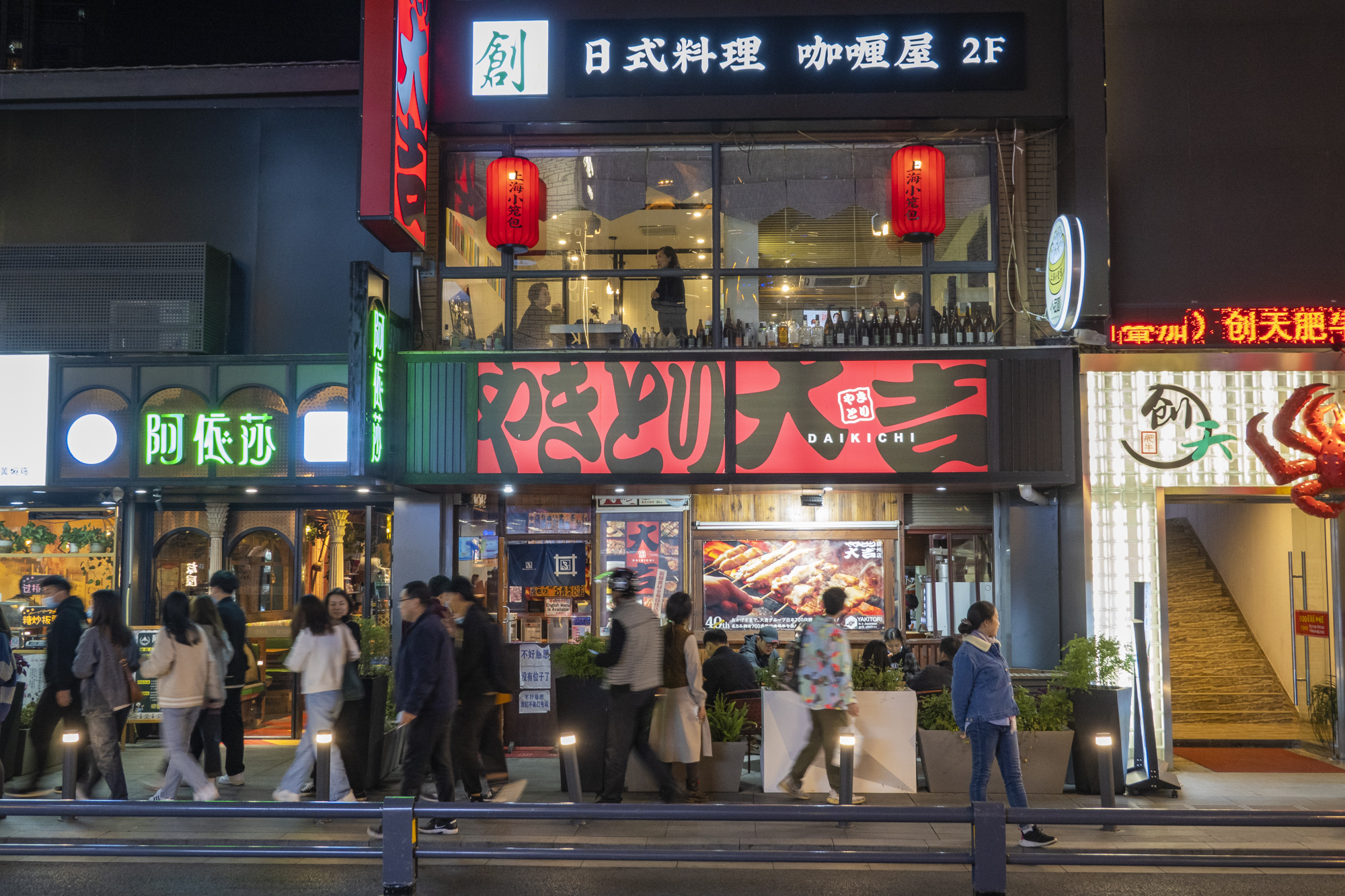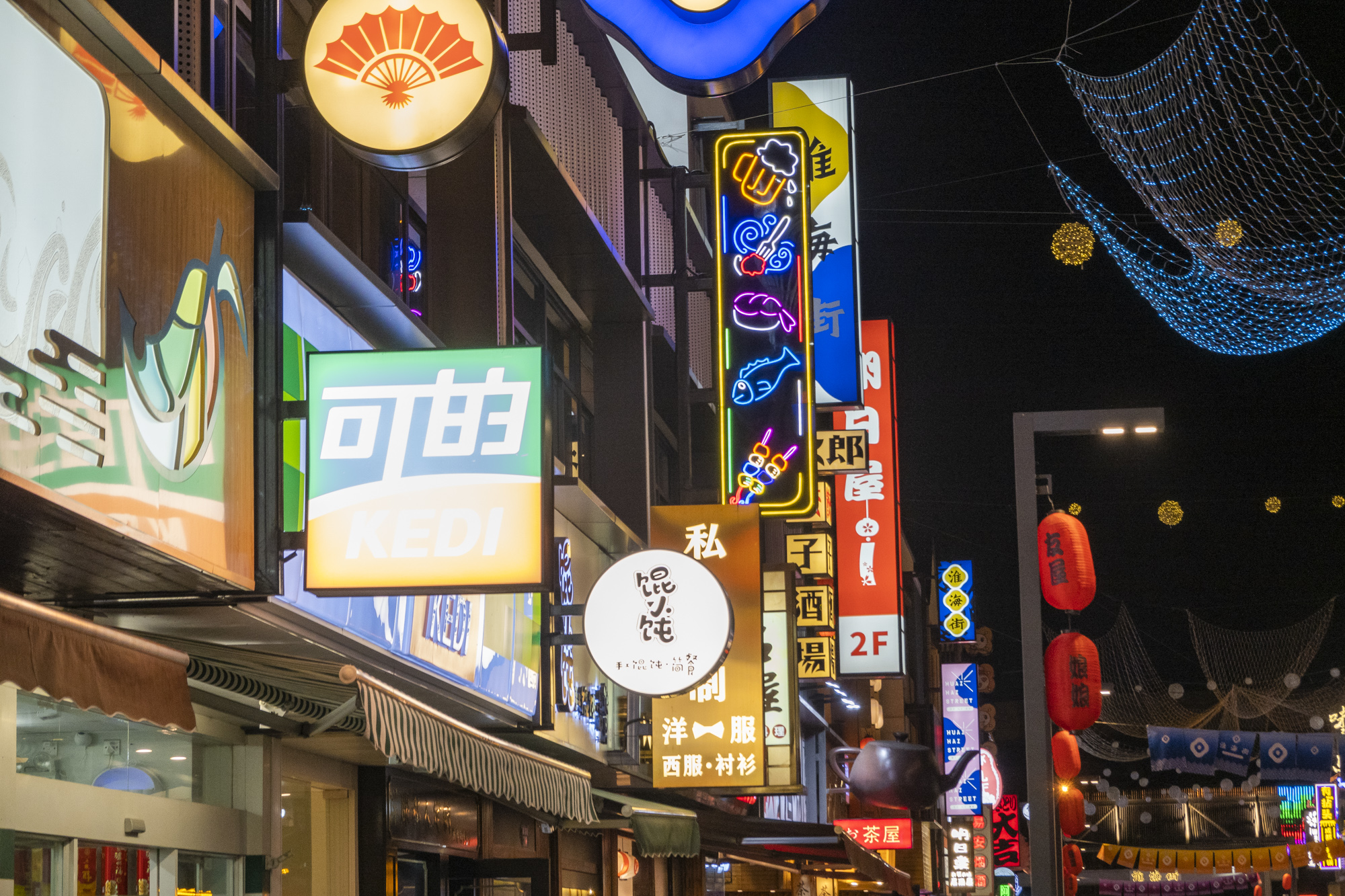 初遇淮海街,满眼日式元素,一盏盏日式风格的灯箱立刻把我拉回去了去年在日本的记忆。相比较我国店铺店名整齐划一的门头,日本料理店的店名都是造型独特、五颜六色的,淮海街上,五六十家日料店,烤肉、寿司、居酒屋、海鲜、蛋包饭应有尽有,好像一下子就穿越了。