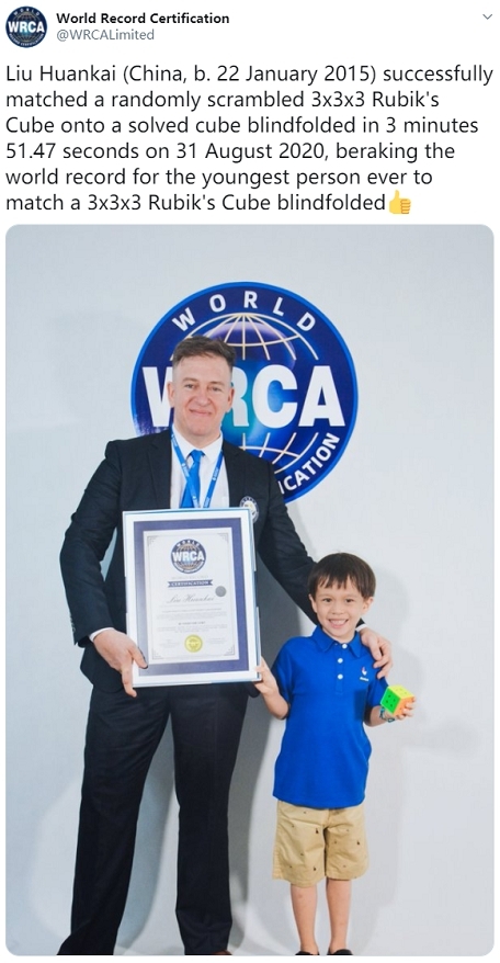 来自中国北京市的刘桓楷(出生日期:2015年1月22日)于2020年8月31日在北京市方圆公证处成功盲拧克隆三阶魔方,用时3分51.47秒。经世界纪录认证机构(WRCA)官方审核,刘桓楷成功刷新“最小年龄盲拧克隆三阶魔方”世界纪录。