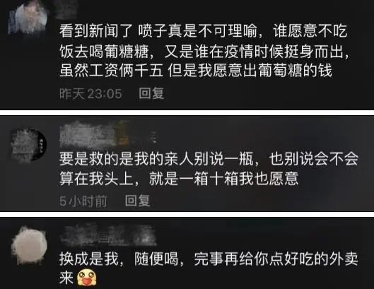 更多的网友则力挺道,医生为了救治患者辛勤工作,他们愿意支付那瓶葡萄糖的费用。