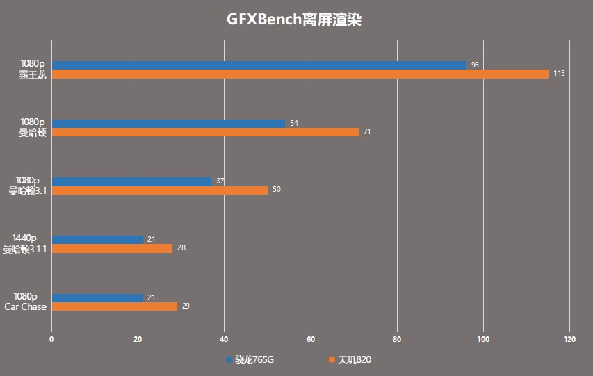 首先在跑分表现方面,虽然同样采用了A76架构作为大核,但天玑820的大核数量和主频都明显优于765G,因此在CPU性能表现上,搭载天玑820的手机Redmi 10X跑出安兔兔41万+的高分明显占优势。同时,在GeekBench 5、GFXBench的性能测试中,天玑820全程保持了领先优势,并且随着负载加大,天玑820的优势也在逐渐扩大。