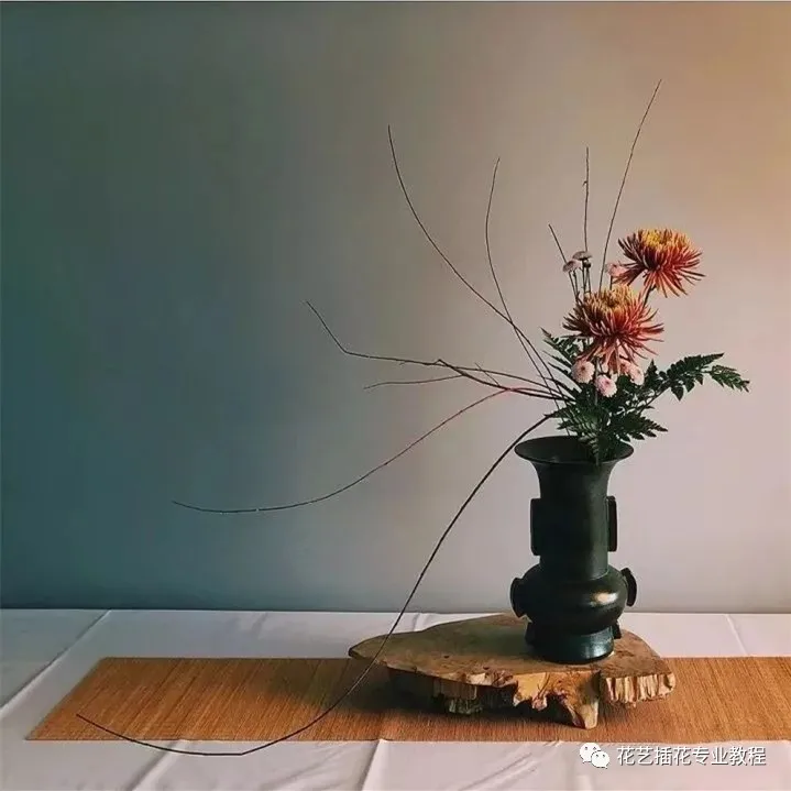 中式插花的基本造型主要由3个主枝来呈现,通过对上下位置、角度的改变,构造出不同的韵味美。构图布局则讲究高低错落,采用不对称的构图形式。