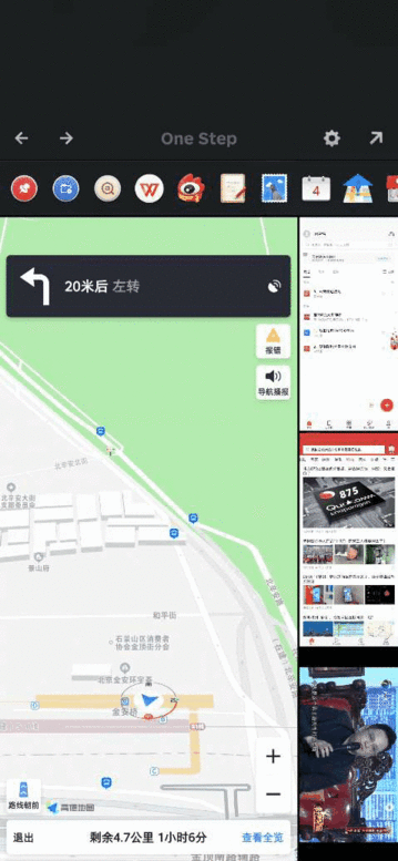同时使用多个应用是很多人都会遇到的场景,但是一般手机在同一时间内只能允许最多一个应用运行,例如我们坐公交的过程中,想要同时使用导航和视频播放两个功能,从导航界面切换到视频播放界面,有可能会使原先正在运行的应用程序中断,并不能做到真正的同步运行。为了解决这个问题,“一步”功能诞生了,能支持同时运行最多四个应用,而且这些应用完全不会相互打断。