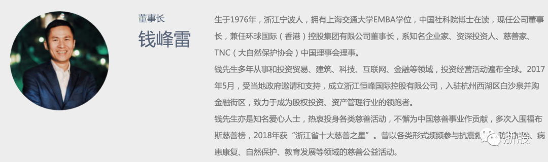 据恒峰国际官网介绍,钱峰雷多年从事和投资贸易、建筑、科技、互联网、金融等领域,投资经营活动遍布全球。2017年5月,受当地政府邀请和支持,成立浙江恒峰国际控股有限公司,入驻杭州西湖区白沙泉并购金融街区,致力于成为股权投资、资产管理行业的领跑者。