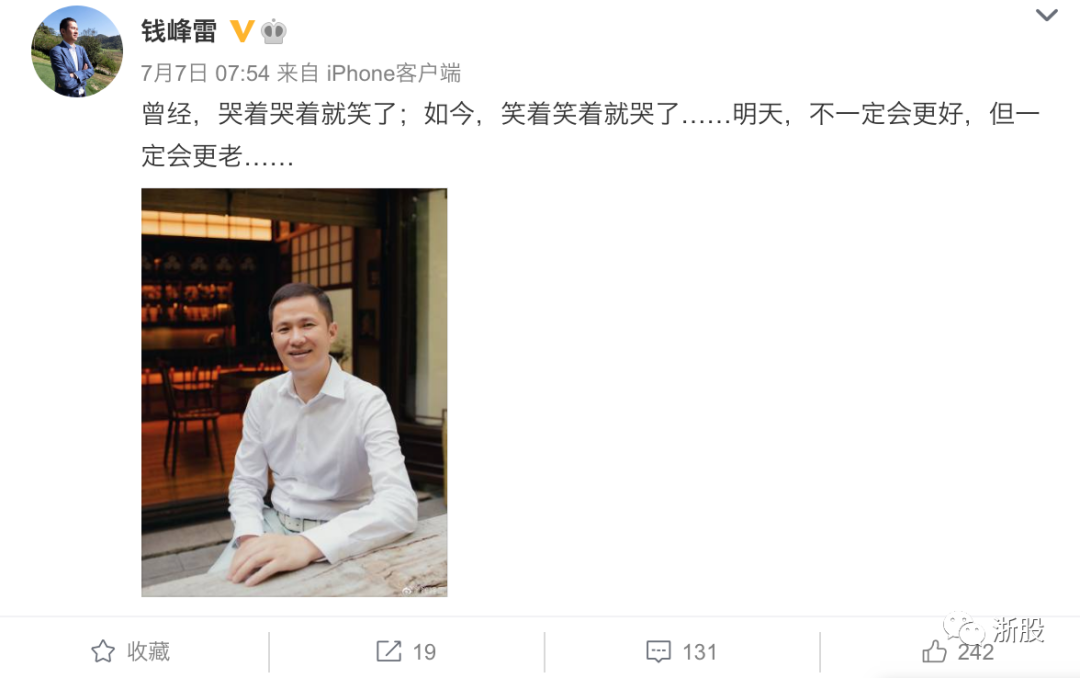 7月7日,钱峰雷写下一条微博:曾经,哭着哭着就笑了;如今,笑着笑着就哭了……