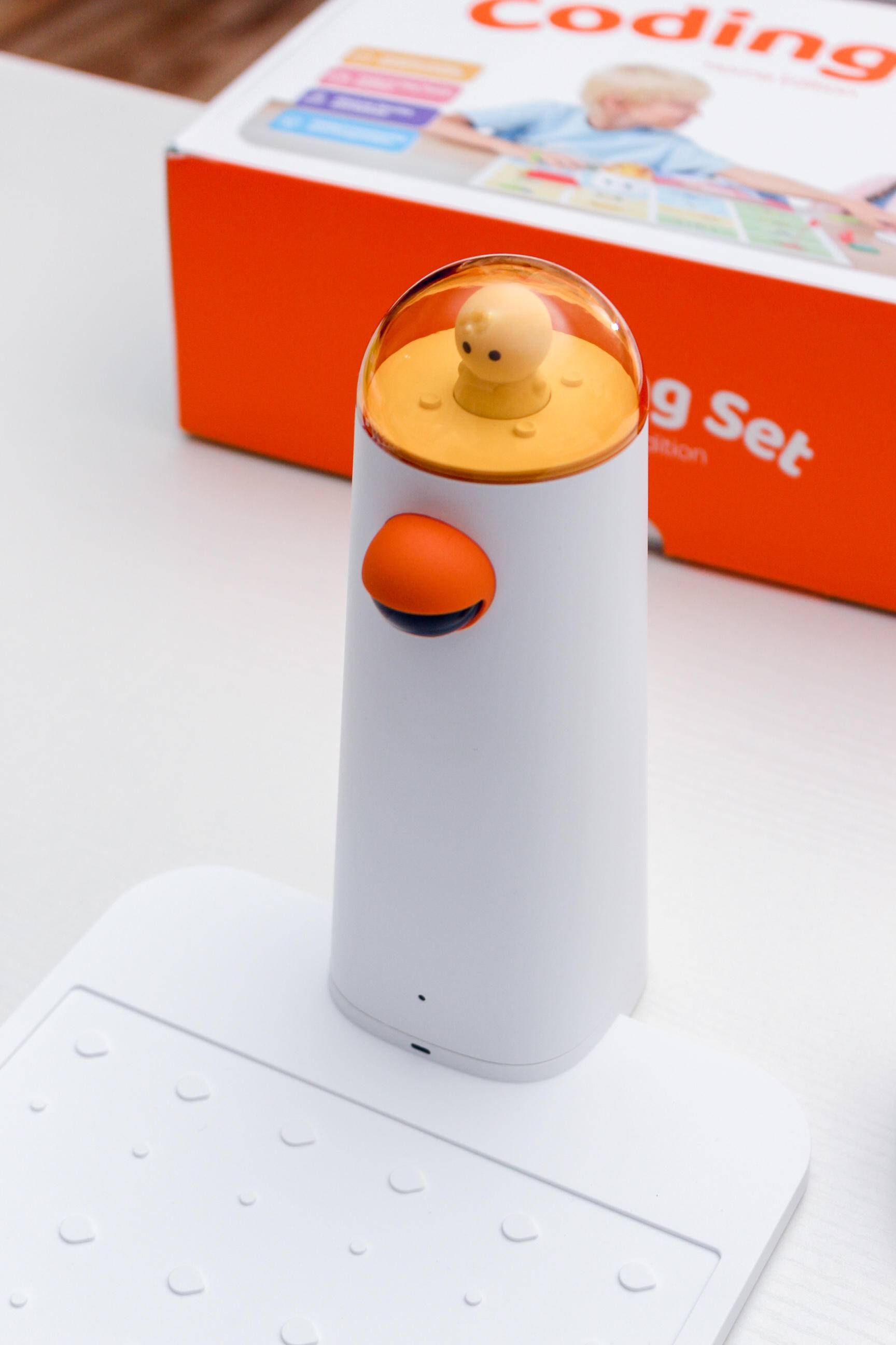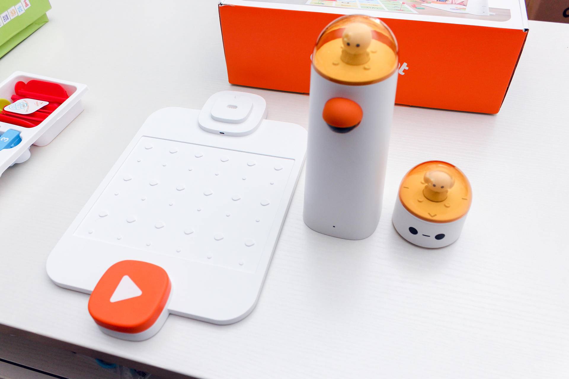 先来看这个玛塔机器人的主要配件,就是最小的玛塔机器人、个子很高的玛塔控制塔、还有长方形的编程板。产品设计统一都是主体白色搭配有橘色以及黑色作为点缀,