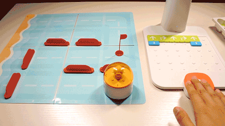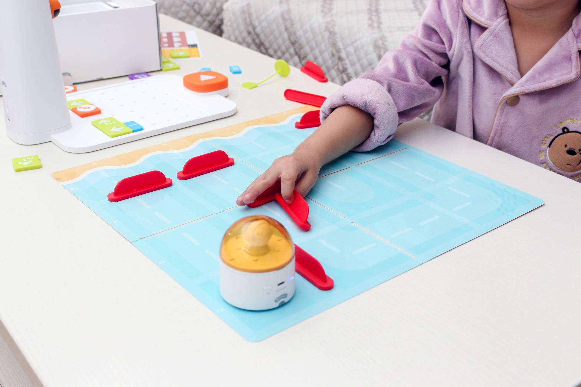 程序的设计可以自由发挥,比如可以利用附送的路障摆出一条路,然后自己尝试用实物编程的方式进行编程,程序的正确与否只要按下橘色的开始键就能进行验证。