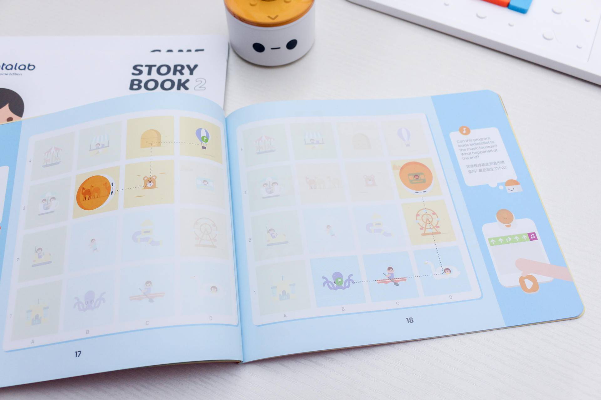 除了可以自己按照自己的想法对机器人编程,还可以参考玛塔编程机器人套装中的书来玩一有趣的游戏。四岁的儿子还不认识字,但是他可以根据书以及地图上的图案来大致看懂游戏的目的。