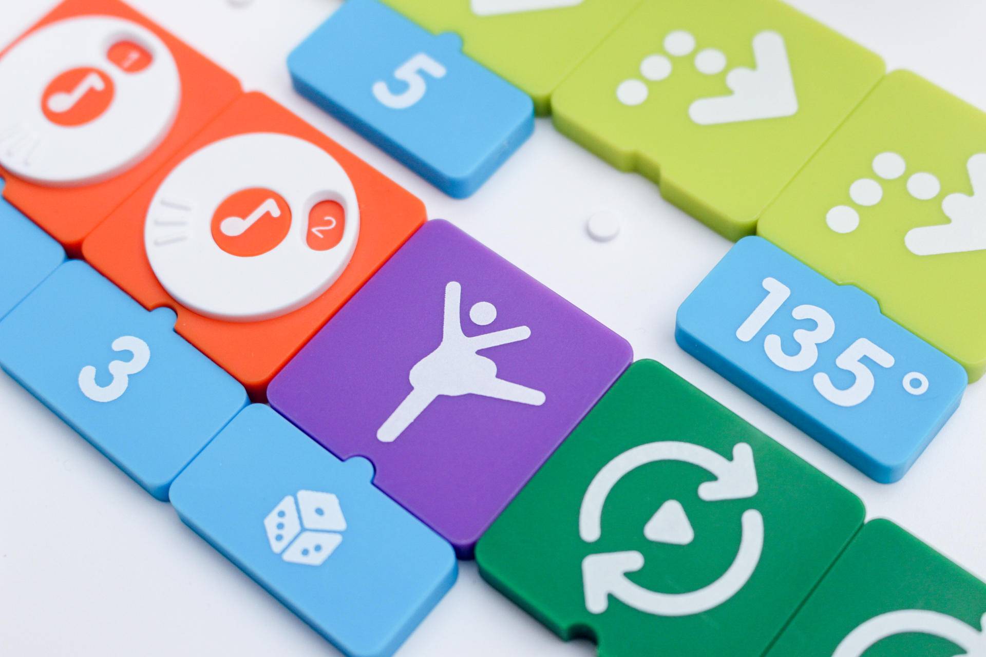 实物编程是玛塔机器人的亮点,不同颜色编程块就是编程的主要工具,包括运动编程块、循环编程块、预设编程块、音乐编程块以及角度编程块。