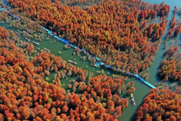 沿着浅浅的弯流,两千亩水杉密集整齐地生长在水中,与宽广碧绿的水面相互映衬。一叶叶竹筏划过,涟漪拨动了彩云的衣裳。焰红的落羽红杉与蓝天白云交相辉映,色彩斑斓,如诗如画。