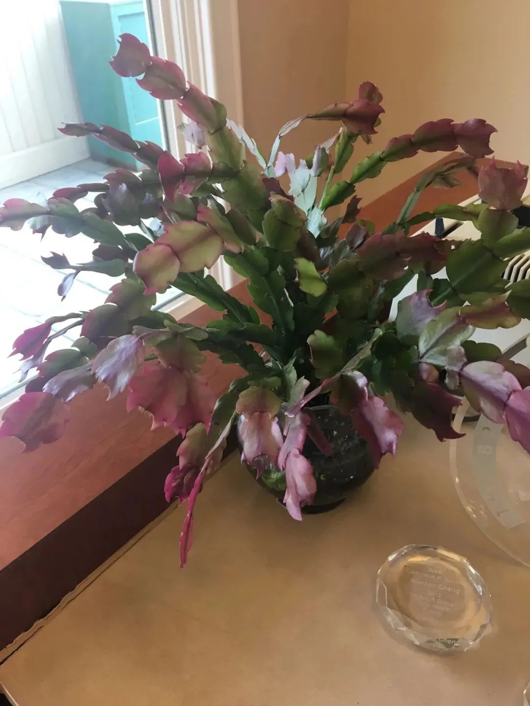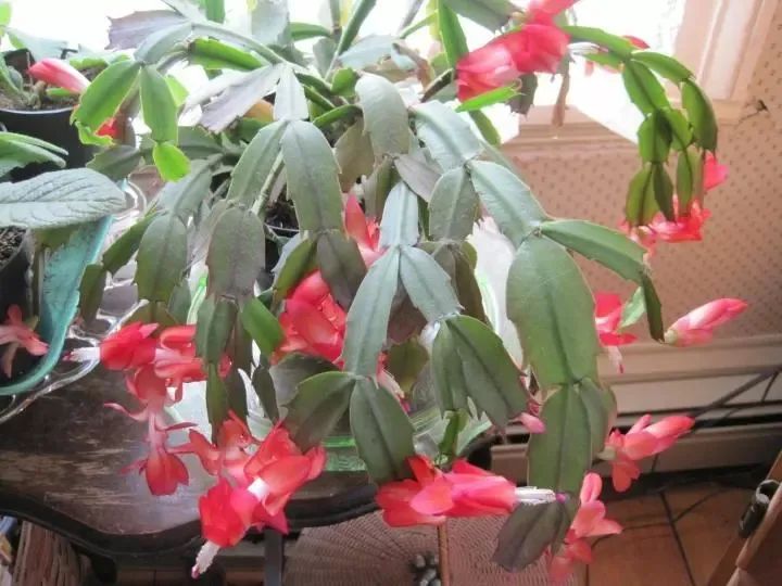 另外,就是注意保持早晚有较大的温差,就是白天和夜晚的温度起码要有10度左右的温差,就可以让蟹爪兰更好开花。保持环境冷凉也是蟹爪兰开花的一个关键,但也不要让温度过低,最低养护温度不要低于8度以下。温度低5度以下,它就有冻伤的可能,如果低于0度以下,不用几个小时蟹爪兰就会被冻死了。
