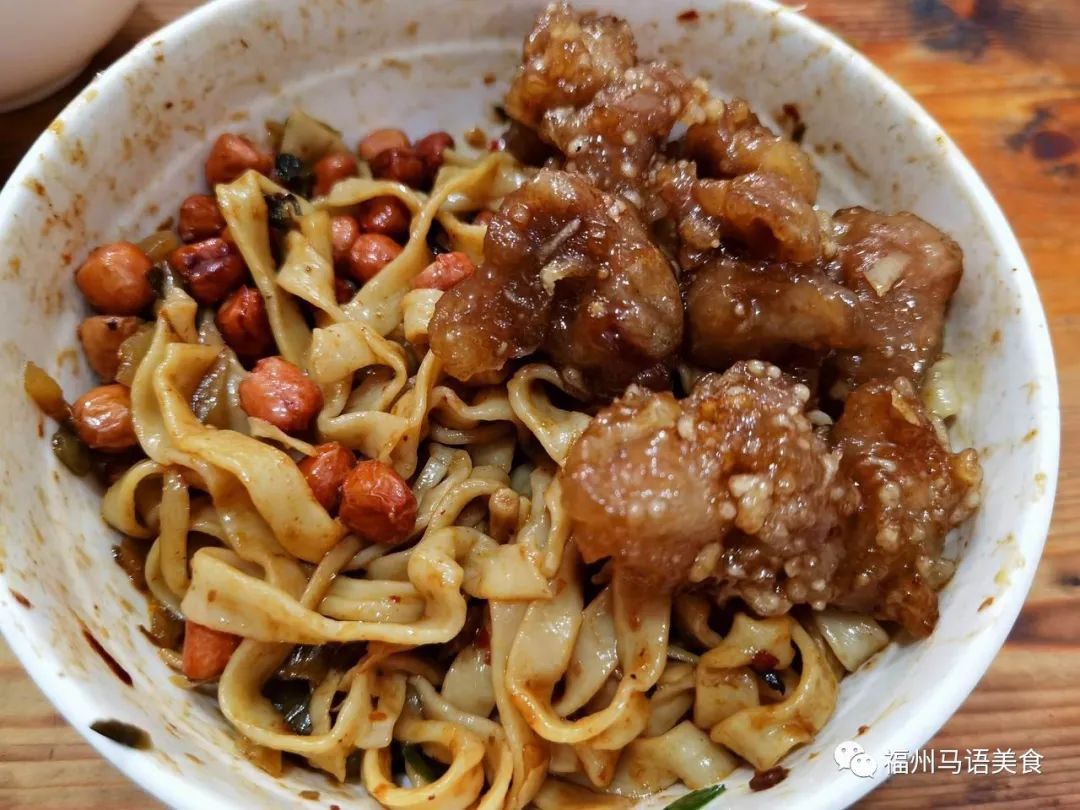 面是扁面,有厚度有韧度,刚刚做的糖醋排骨酸甜极重,还热的花生米是绝佳拌面搭档,让每一口都既有糖醋肉香,也有花生米的清香,同口大嚼,心里大赞好吃。