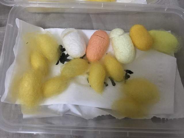 金黄色的蚕茧是我国近年来在引进培育的新品种,它是通过中国本土桑蚕和日本蚕杂交,再和越南蚕混血,最后培育出来的蚕宝宝吐出来的丝是金黄色的!