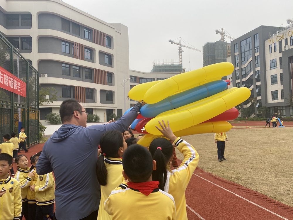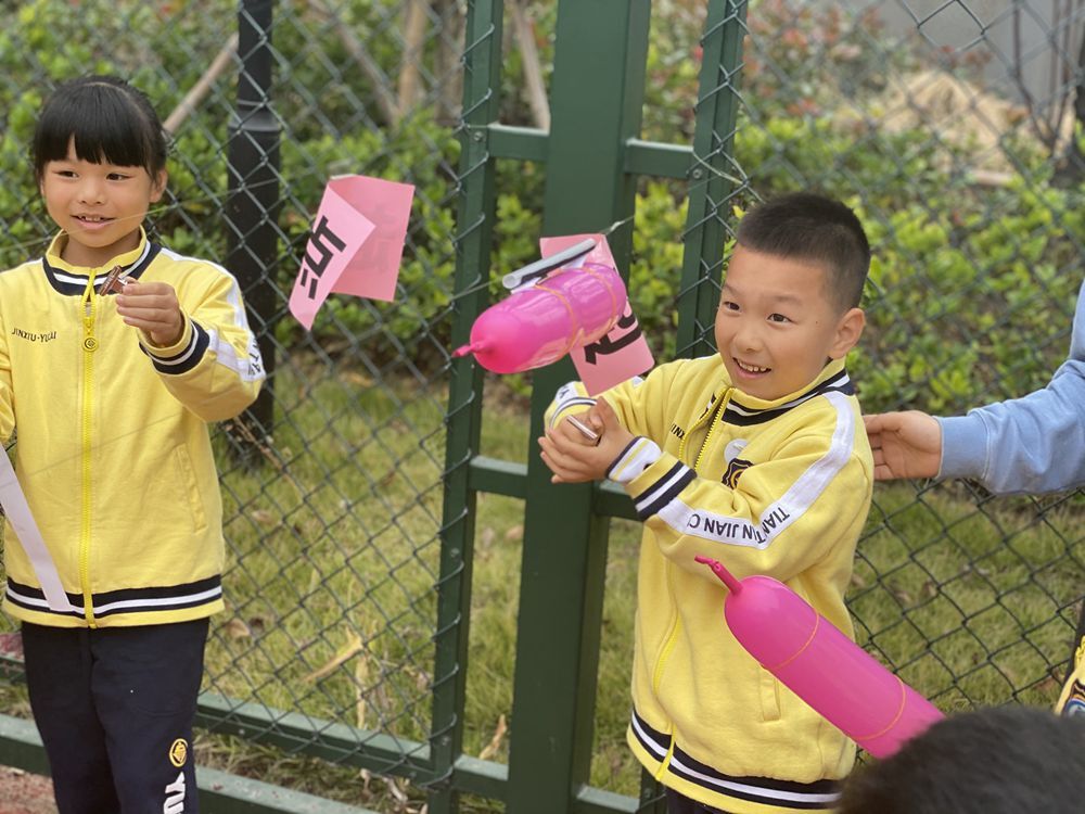一二年级学生的作品是《气球定点发射》,孩子们拿着事先准备好的打满气的气球,列队在起点处,随着裁判的一声令响,气球“嗖”一下沿着轨道发射了。