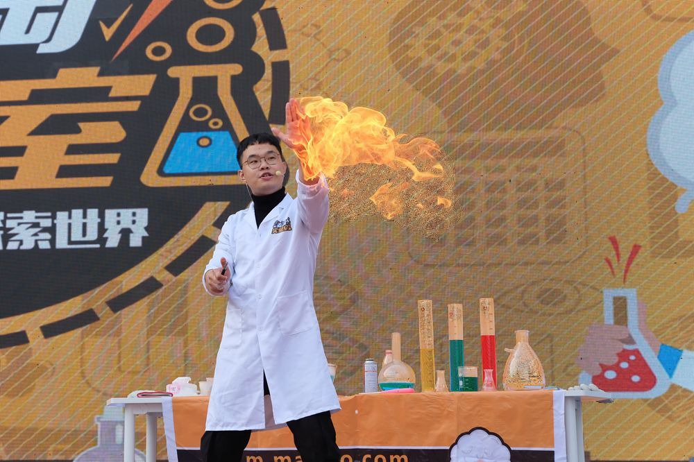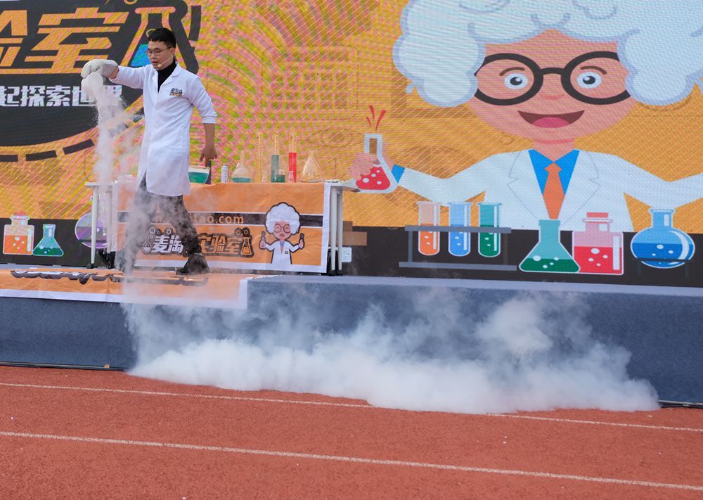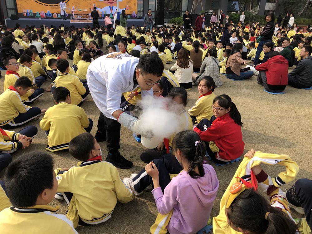 下午,各年级800多名孩子坐满操场,科学组为孩子准备的“科学秀”的展演时间。一会儿,科学老师为孩子们展示了“头发喝水”,“冰火奇缘”;一会儿,科学老师练就了一手“火焰掌”,台下的孩子们不断惊叹道“哇哦……哇哦……”;一会儿,科学老师又将树叶冻成冰,整个操场都沸腾了,高年级的学生情不自禁地用英语说:“so cool!”