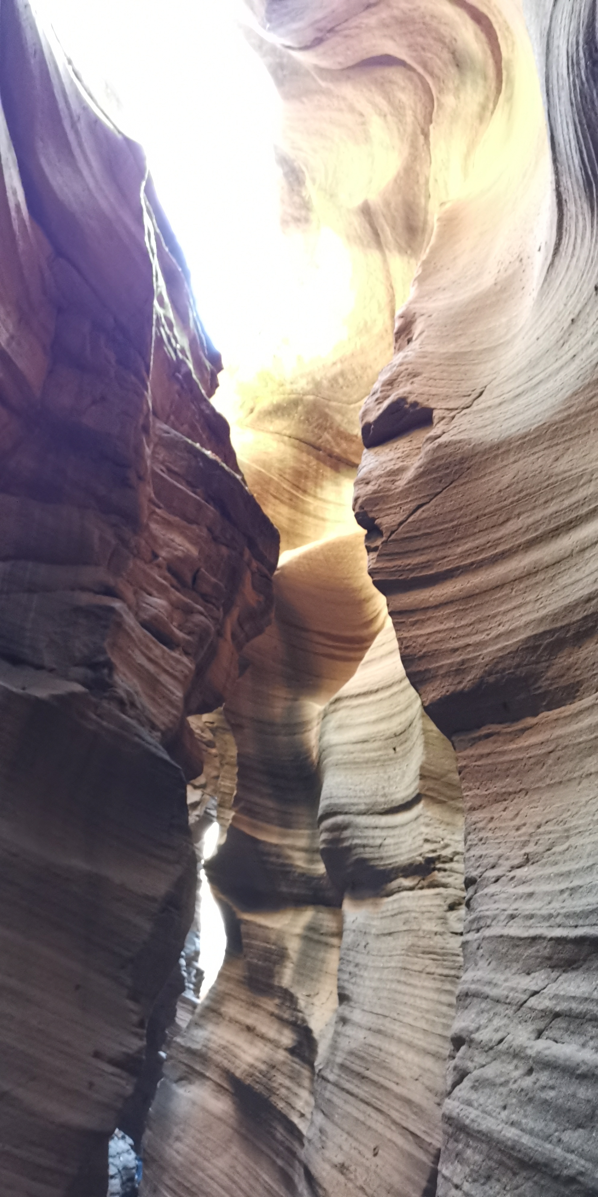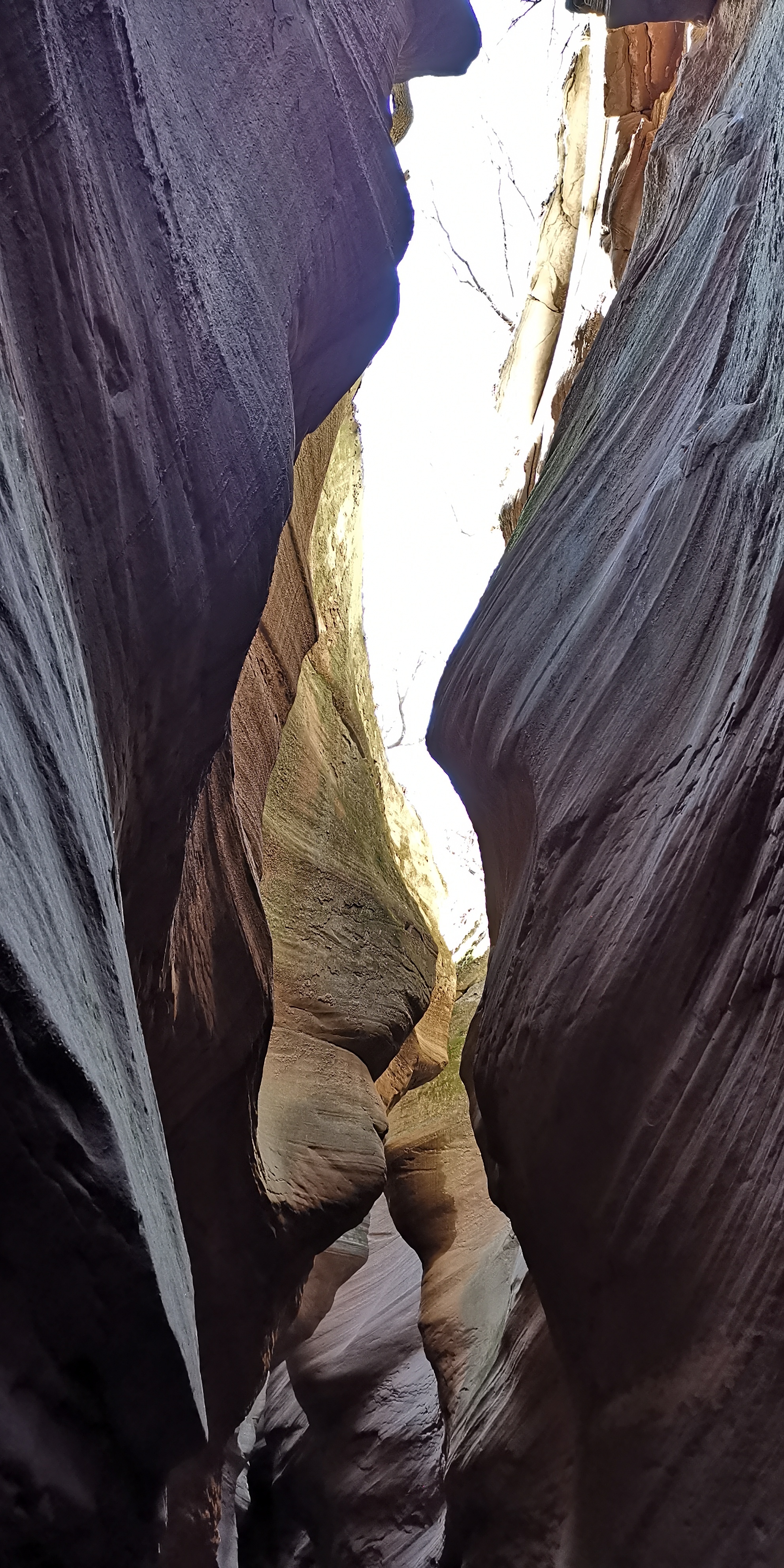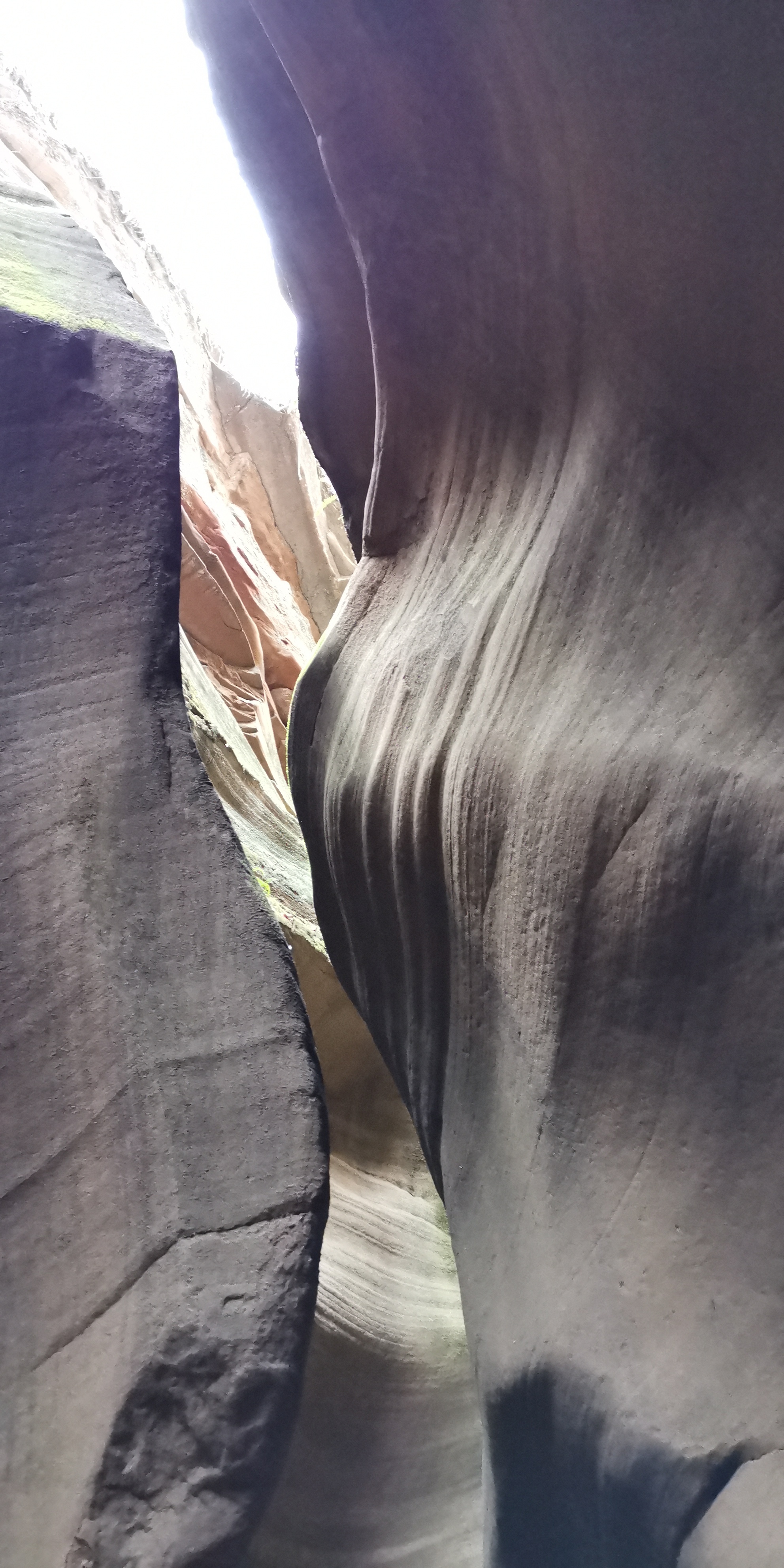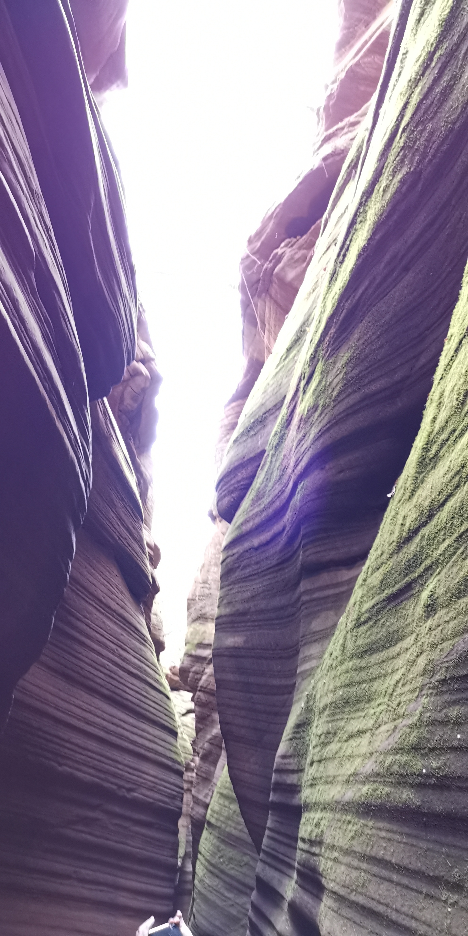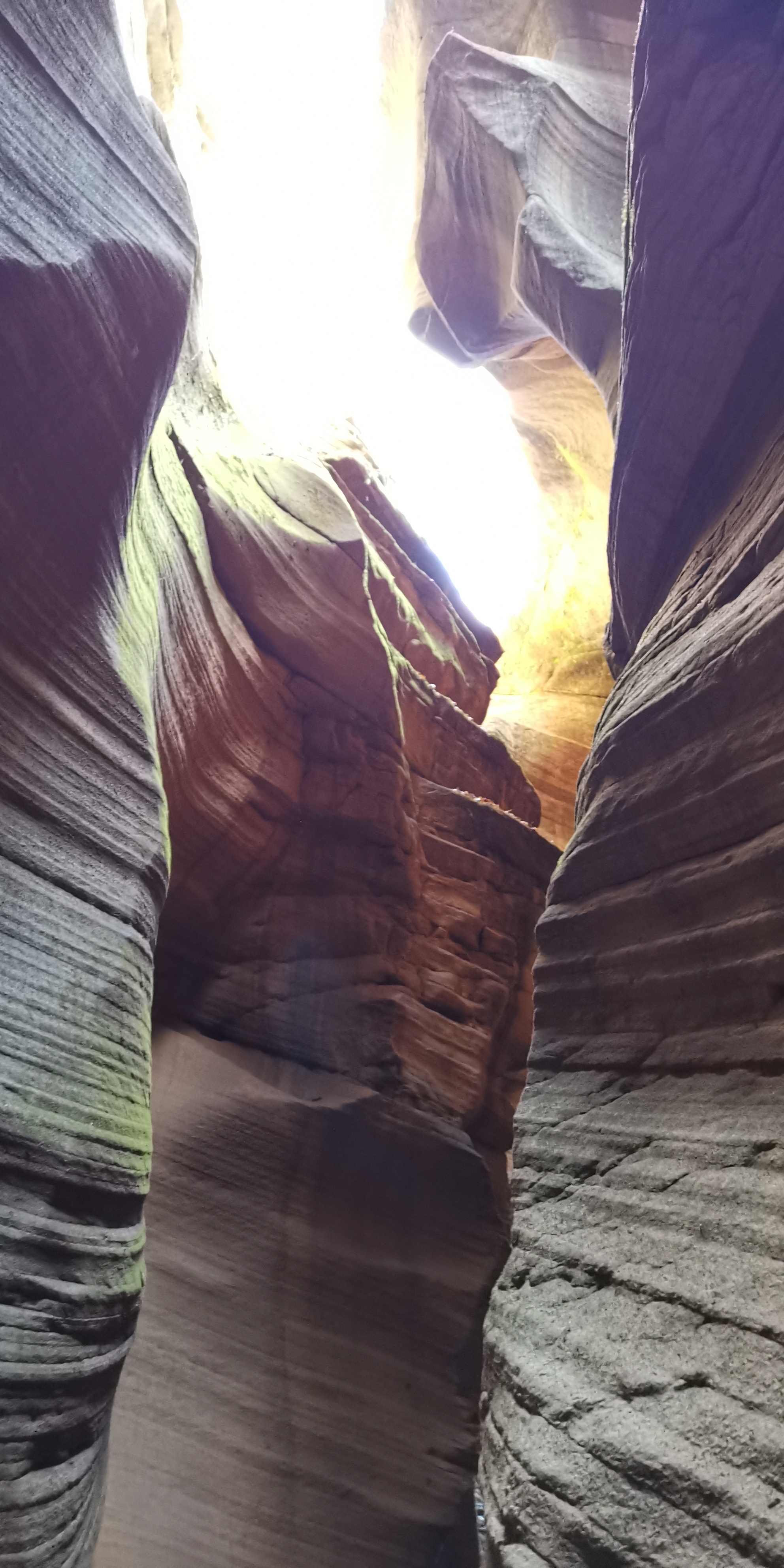 土黄色的狭缝怪壁原本色调单一,当遭遇了雨水,再逢雨后阳光照射入地缝时,光学物理与土壤地质化学成分交互作用,峡壁显现出奇特的斑斓色彩,似幻如梦……
