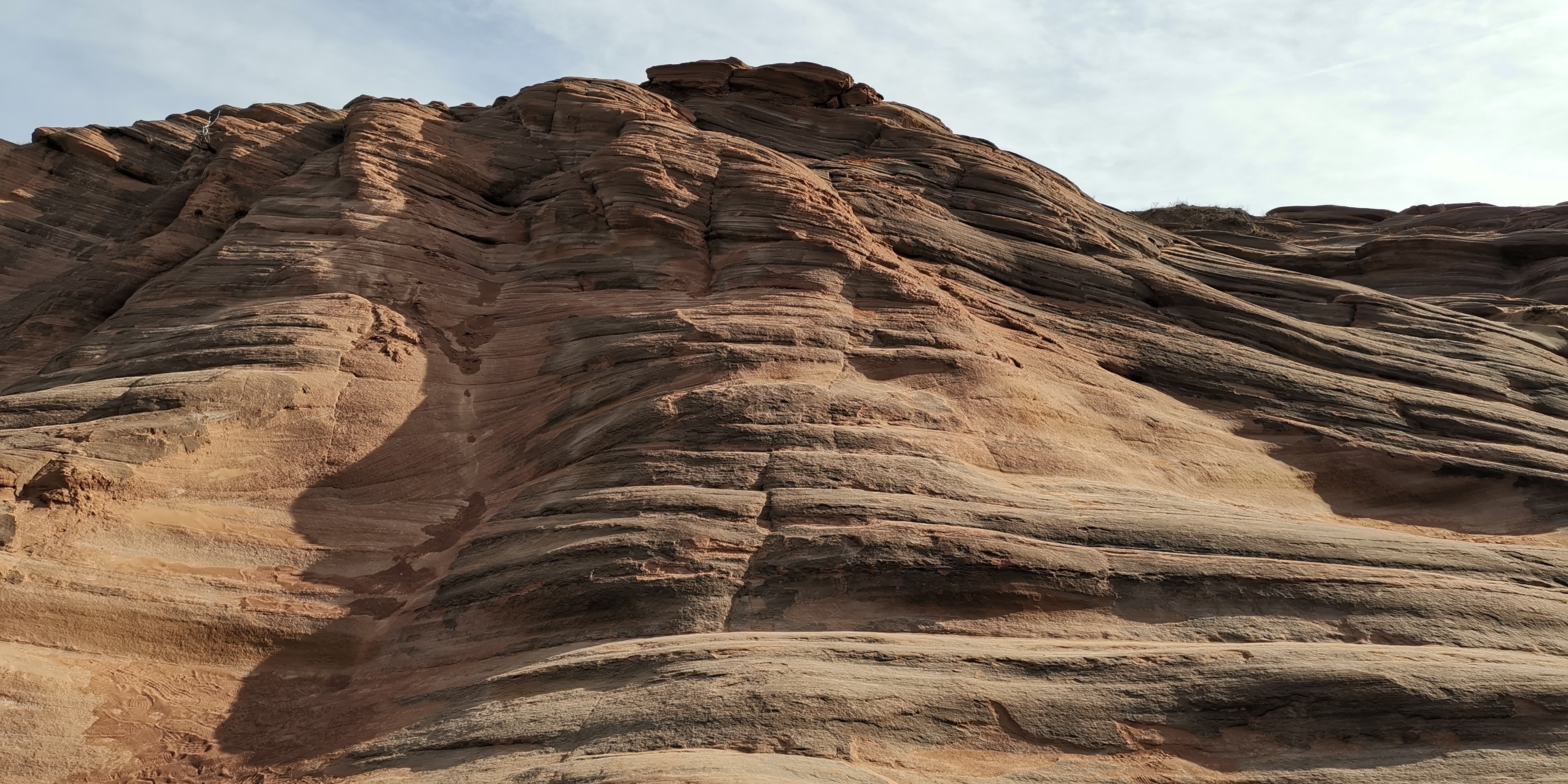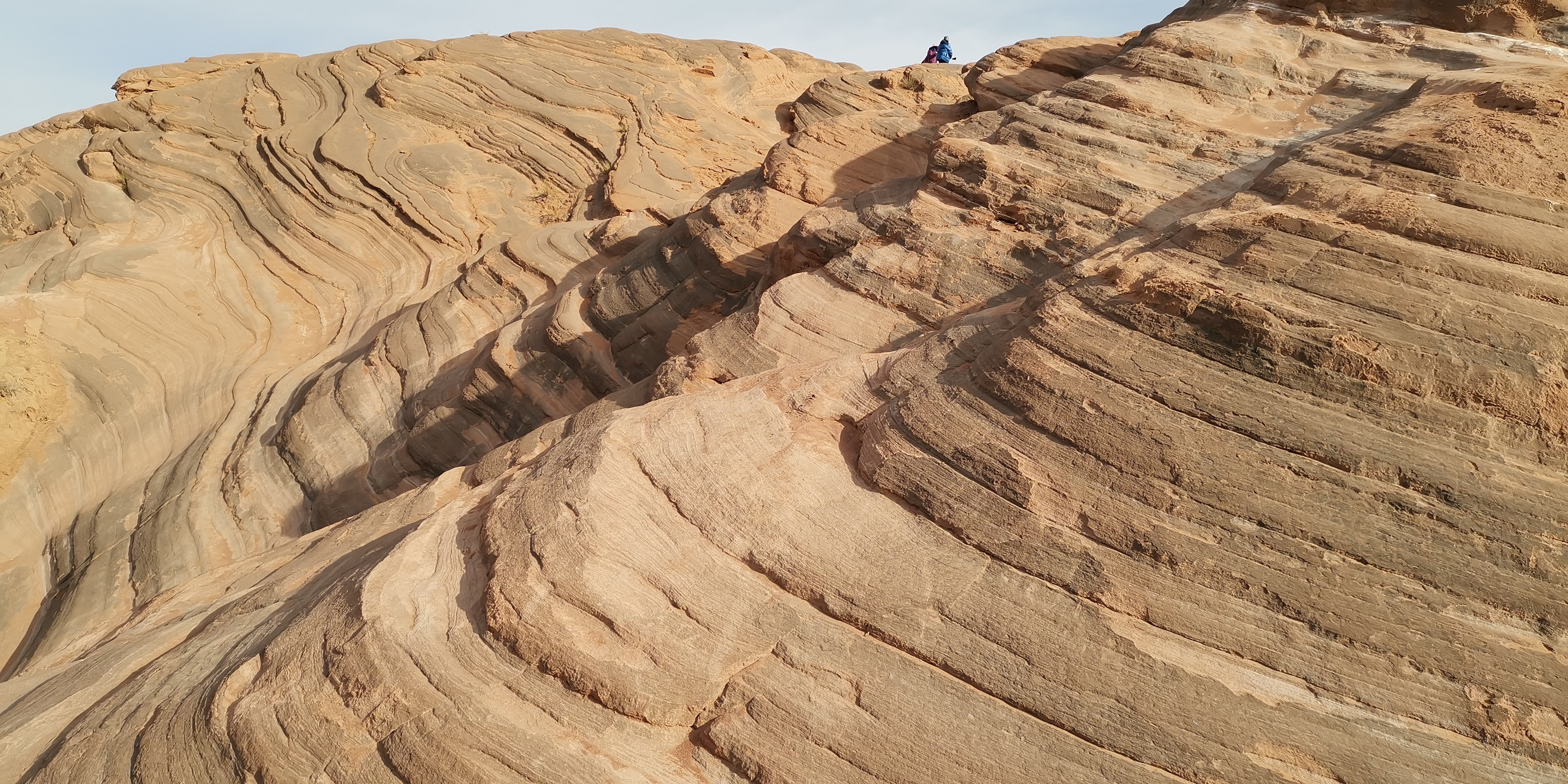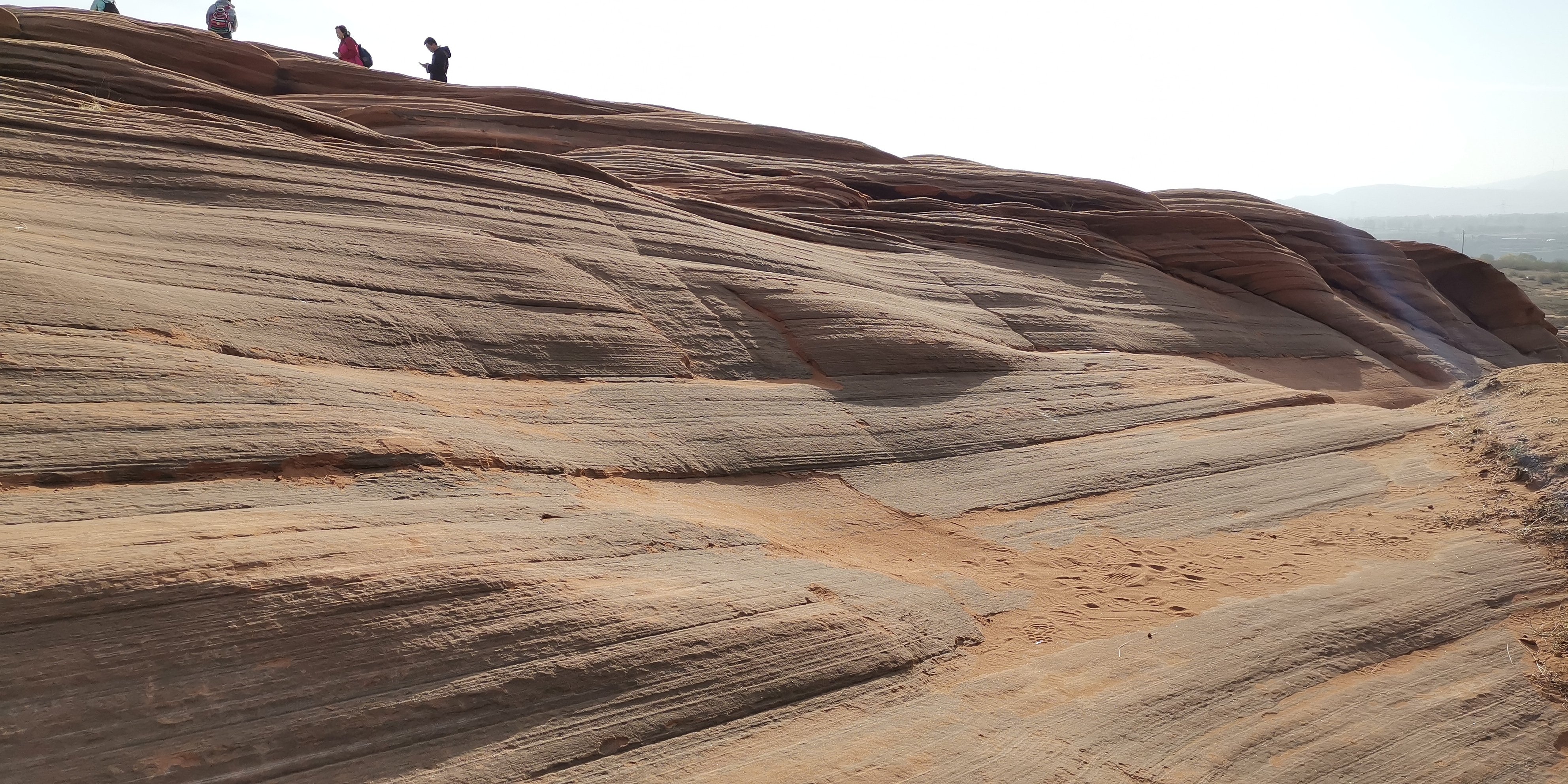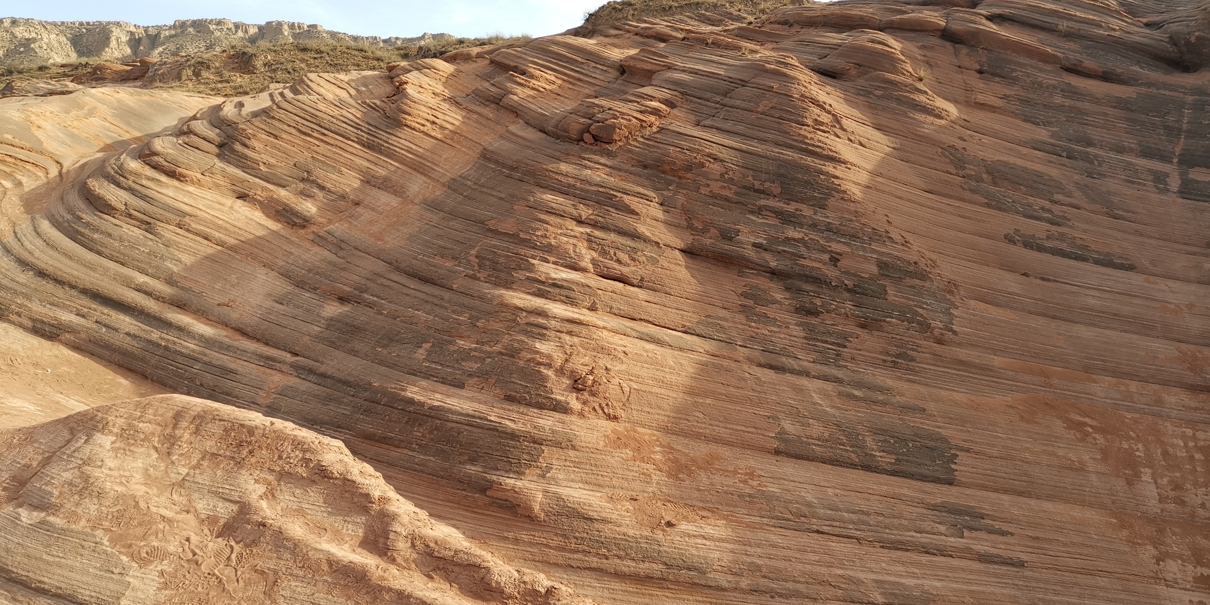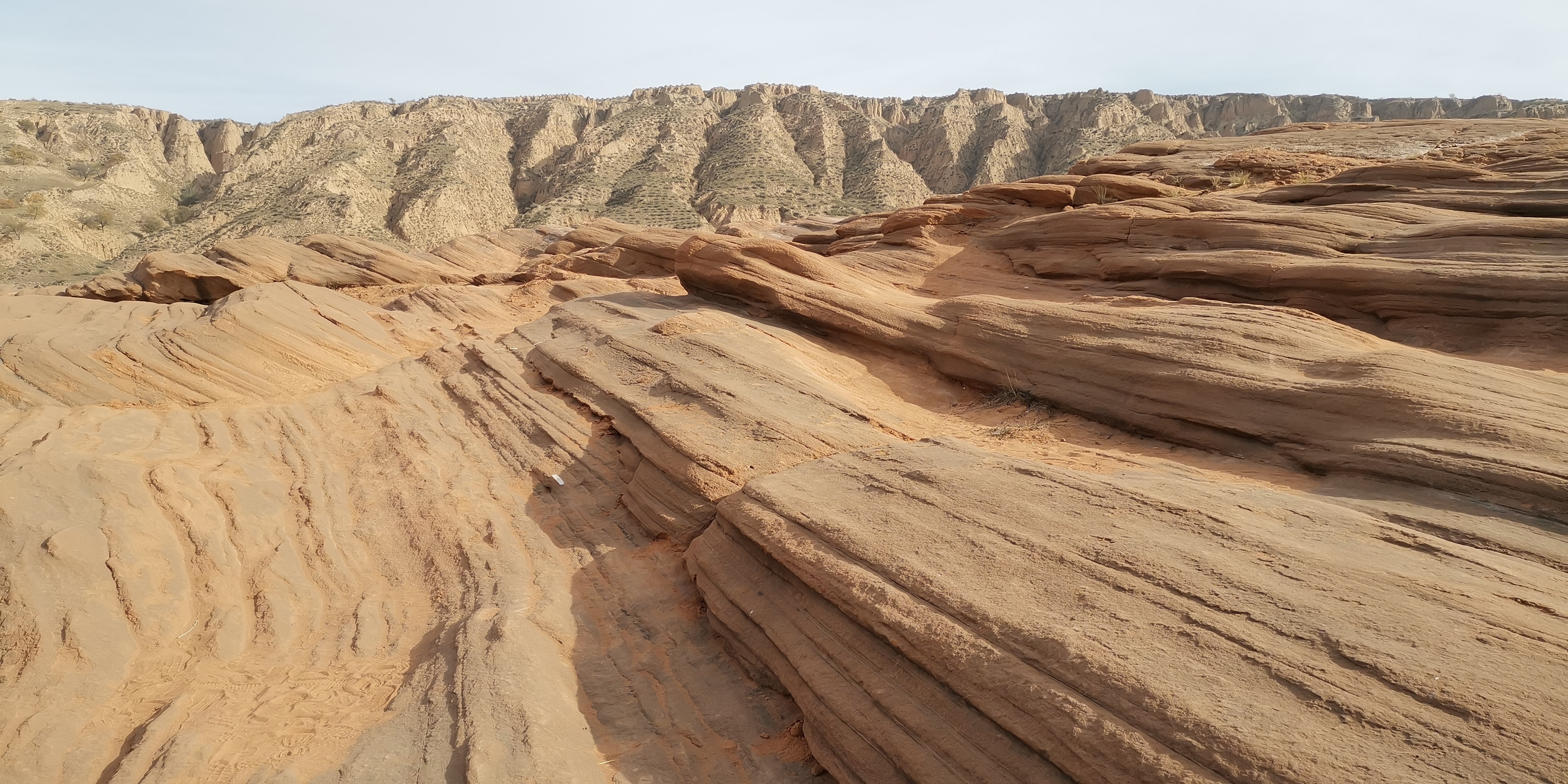 来到波浪谷,眼前裸露着苍凉的红色岩石,像泥石流一样呈现出一种流水状,一圈圈、一坨坨、一弯弯的向沟壑中涌去。这种类似沙岩的地貌,风化剥蚀很严重,表皮附着一层红色细沙。狭窄处,暗红砂岩仿佛赭红色泥浆纷涌汇聚,又似黄土高坡上冒出的一股铁锈红水缓慢地向低洼处的沟底流淌。其地势相对平缓处,那些层层叠叠的岩石就像染坊浸染过后铺展在地面上晾晒的铁红色布匹,一层层、一卷卷、一盘盘在丽日的光合作用下,色泽愈发浓烈,极像上帝留下的指纹。追寻红岩的踪迹,眼前是高矮不一、起伏不平、参差不齐的红岩丘陵。赭红砂岩仿若波浪般凝固于沟壑里,像一株株红色的冰挂,又似一股股冰封的岩浆……
