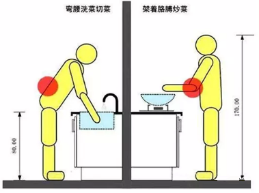 高低台,顾名思义就是一个台面高,一个台面低。通常情况下厨房水槽是低于台面的,洗菜洗碗时我们需要弯腰,如果抬高水池一边的台面高度,会让人在使用水池时更舒适。同理,降低灶台高度,就不会出现架着胳膊炒菜胳膊酸痛的情况了,这样的高低台设计更符合人日常厨房动作行为,有效缓解肌肉长时间逆位的酸痛,腰、肘、肩部都可以减轻负担。