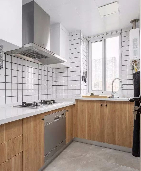 如果厨房布局是水槽和灶台分别在两边,那刚好可以将两边的台面做成两个高度。L形转角处正好做区域切分,是高低台最常见的分割方式,这样的分割视觉上也不会太突兀。