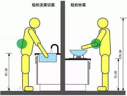 厨房台面的具体高度要根据做饭人的身高来定。一般来说,灶台高度降低,大概在70-80cm;水槽台面抬高,大概在80-90cm,两者高度差在10cm左右。不要小看这小小的10cm的变化,带给人的体验是差别很大的。