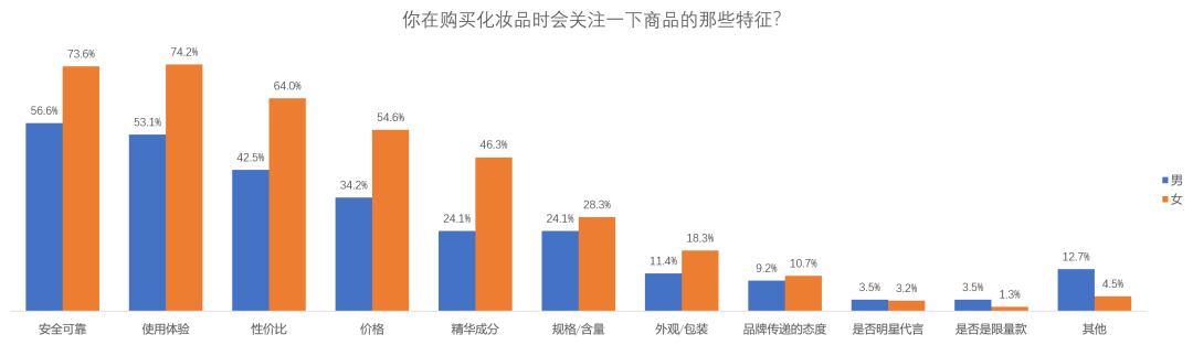 购买化妆品时,安全性、使用体验是Z世代最首要考虑的因素;除此之外,46.4%女性也会对化妆品的精华成分有关注。女性往往在化妆品上有着更多的投入,她们对商品质量的需求显著高于男性。