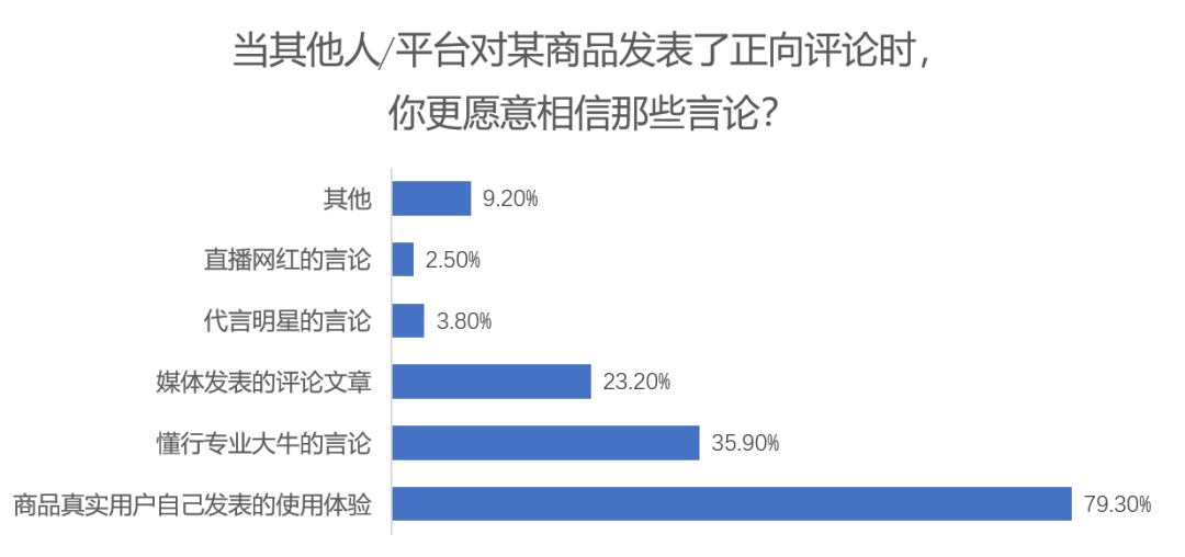 79.3%的Z世代表示自己会相信商品真实用户自己发表的使用体验,此外对懂行的专业人士的言论也有着35.9%的Z世代保持着听取的倾向。媒体发表的评论文章有着两成以上的Z世代选择相信,而代言明星与直播网红的言论往往被参考地极少。