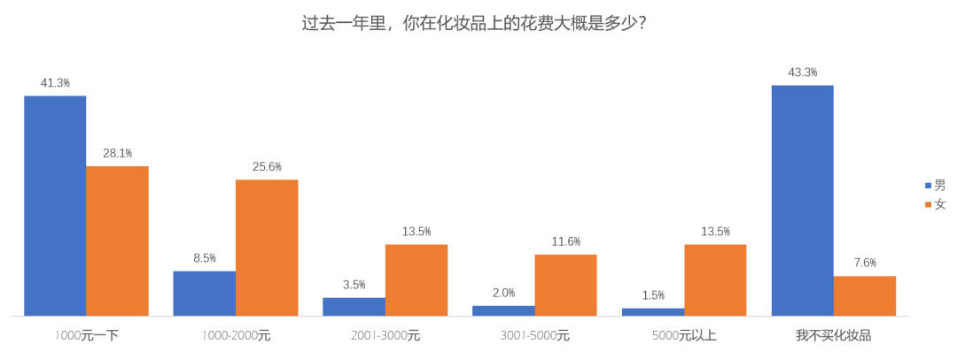 腾讯《2019 Z世代消费力白皮书》显示,目前已有92.4%的Z世代女性会购买化妆品,且接近四成的消费者每年在化妆品上的消费在2000元及以上。对比而言,会购买化妆品的男性刚过一半,为56.7%,而他们中的大多数每年消费也维持在1000元以内。