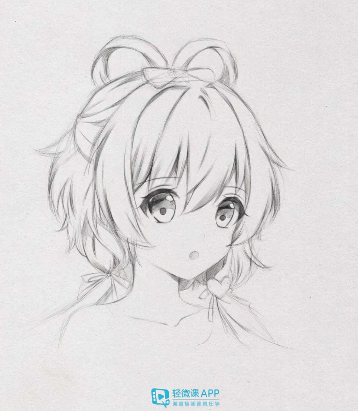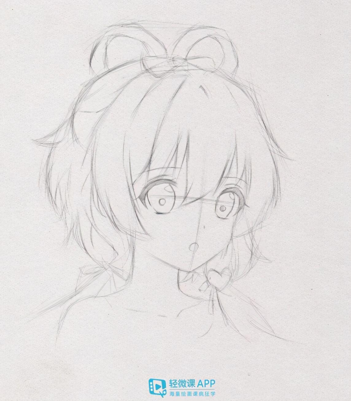 1、用辅助线确定透视和五官位置,接着用简单的几何形体画出头发的结构,这一步要耐下心来慢慢画,不要太拘泥于细节,主要是为了确定形体和比例。