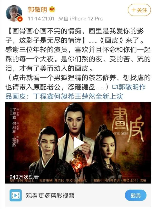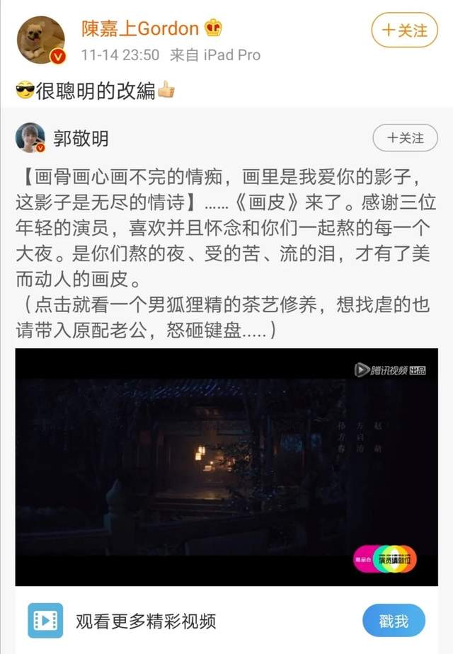 郭敬明改编版《画皮》得到了原导演陈嘉上的肯定,点评这是“很聪明的改编”。经典固然难以超越,改编却也不乏亮点。原版《画皮》中小唯饰演者是周迅,郭敬明改编版另辟蹊径选择丁程鑫来扮演小唯。“一个男狐狸精的茶艺修养”,光看介绍就使人浮想联翩。
