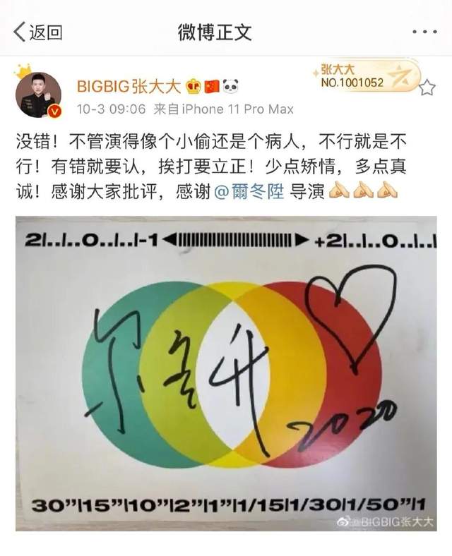 事后张大大发布了一则动态,表示尔冬升说得没错,“不管演得像个小偷还是个病人,不行就是不行,有错就要认,挨打要立正”。并感谢了尔冬升的批评,还晒出附有尔导签名的图片。