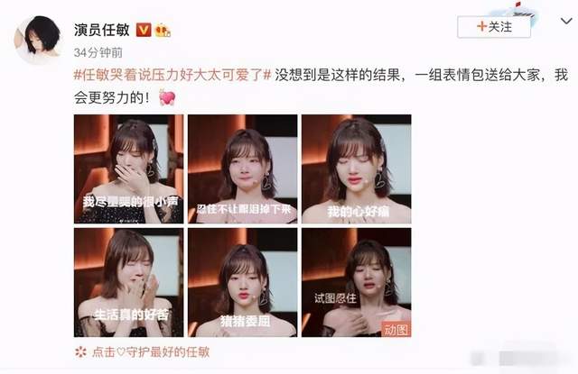 表演结束任敏忍不住落泪,哭着说“压力越来越大”,事后她还将自己流泪场面做成表情包,心酸中透露出一丝好笑。