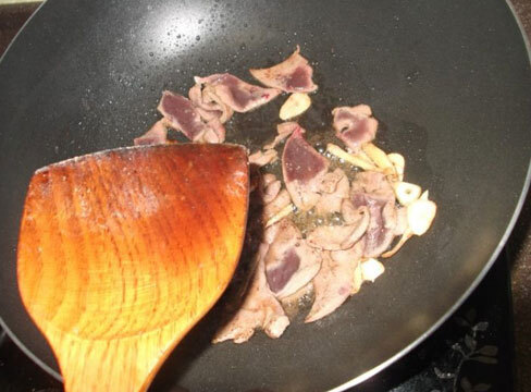 8、热锅中放适量油,等油热后,将腌制好的猪肝下锅滑炒,等猪肝一变色,立刻铲出待用;