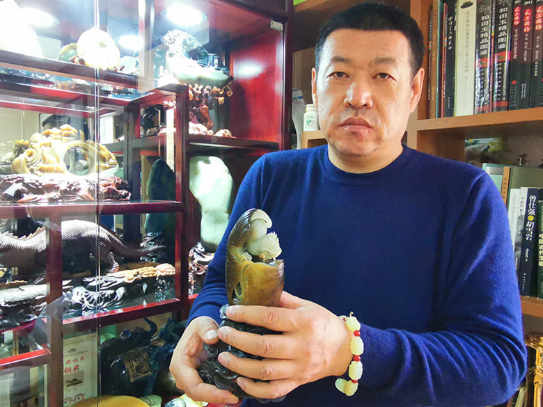 赵军:我觉得要认真对待每一块美玉,要精雕细刻,精工细雕才能把它雕出来,出一件好的作品,给消费者惊喜,他买上后心里面高兴。不然的话,他买上一块心仪的玉件回去心里不舒服,自己觉得也没有意思。