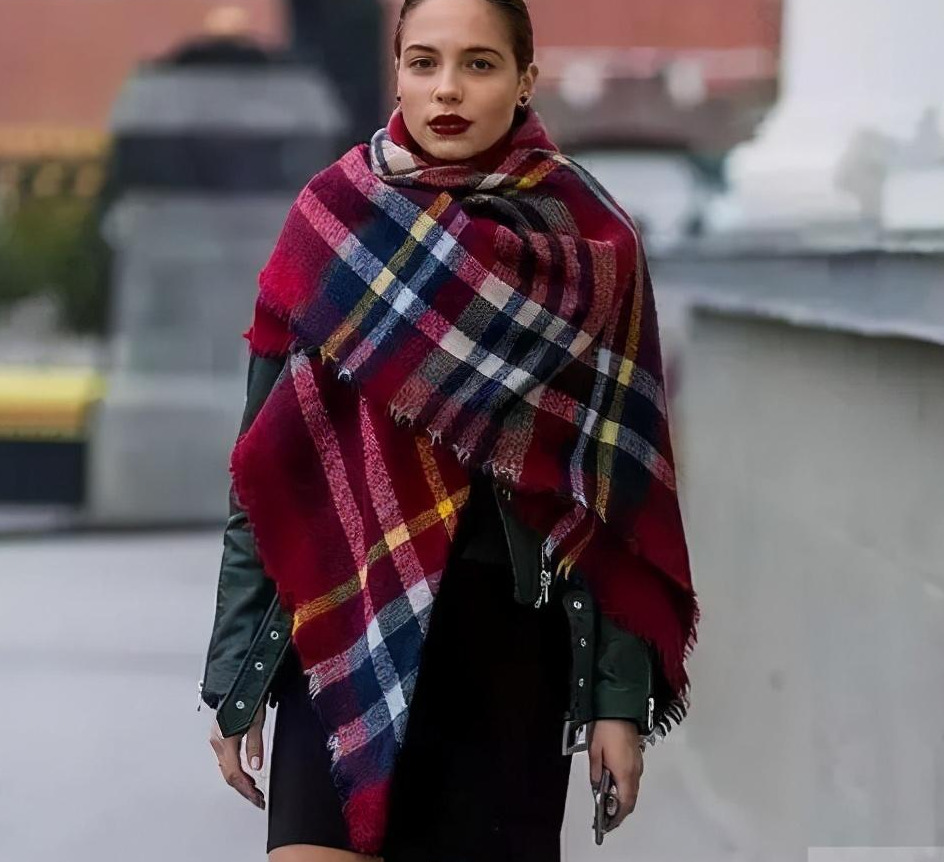 2、披肩型的围巾,是很多时髦人热爱的款式,将围巾披在肩头,气场瞬间飙升,御姐范十足。而披肩型的围巾,可以选择面料厚实柔软的羊毛羊绒这种类型,避免用丝巾或者面料太薄的围巾。