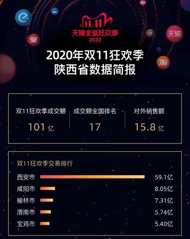 根据阿里巴巴公布的数据显示,“双11”陕西省交易额为101亿元,相比去年的56.8亿增幅达77.8%,成交额全国排名第17,对外销售达到15.8亿元。