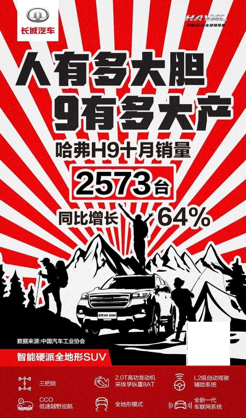 通过上文的对比不难看出,在动力、舒适性、保养费用等方面哈弗H9-2020款优势尽显,而汉兰达的表现与身价相差甚远。不仅如此,在刚刚过去的十月,哈弗H9-2020款以月销2573台的成绩,再次夺得在产中大型SUV细分市场销冠,凭借实力赢得消费者的喜爱,毕竟销量是最好的证明!