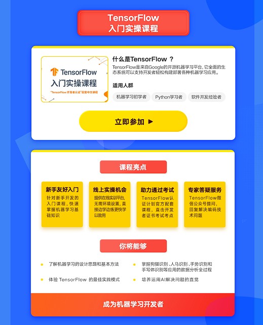 以TensorFlow入门实操课程为例。作为来自Google的开源机器学习 平台,TensorFlow全面完善的生态系统已能支持开发者轻松部署各种机器学习应用。不少新人之前苦于缺乏相应教学及实操机会。现在,全新上线的入门课实操程能提供线上实操机会,从而让新手也能更加轻松上手TensorFlow平台。课程内容与TensorFlow认证计划匹配,并且由数位经验丰富的大学老师以及机器学习GDE授课。