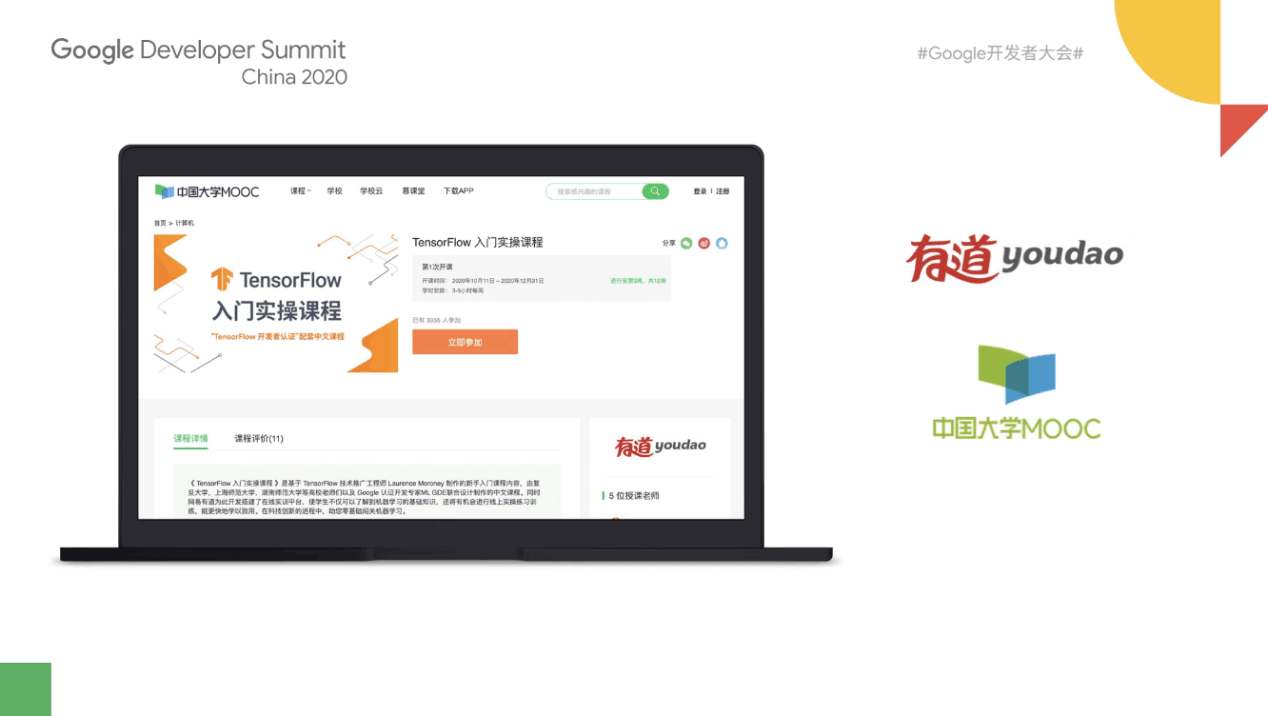 本次大会开幕式上,Google大中华区总裁陈俊廷介绍,Google于2019年发布“Grow with Google成长计划”,而今年Google与网易有道携手,在中国大学MOOC平台上线“Grow with Google”学习专区,并首发“TensorFlow入门实操课程”、“ARCore开发入门课程”和“海外数字营销课程”三门课程,旨在助力人才成长与发展,让学生和开发者们可以更触手可及地学习各类技术和知识。