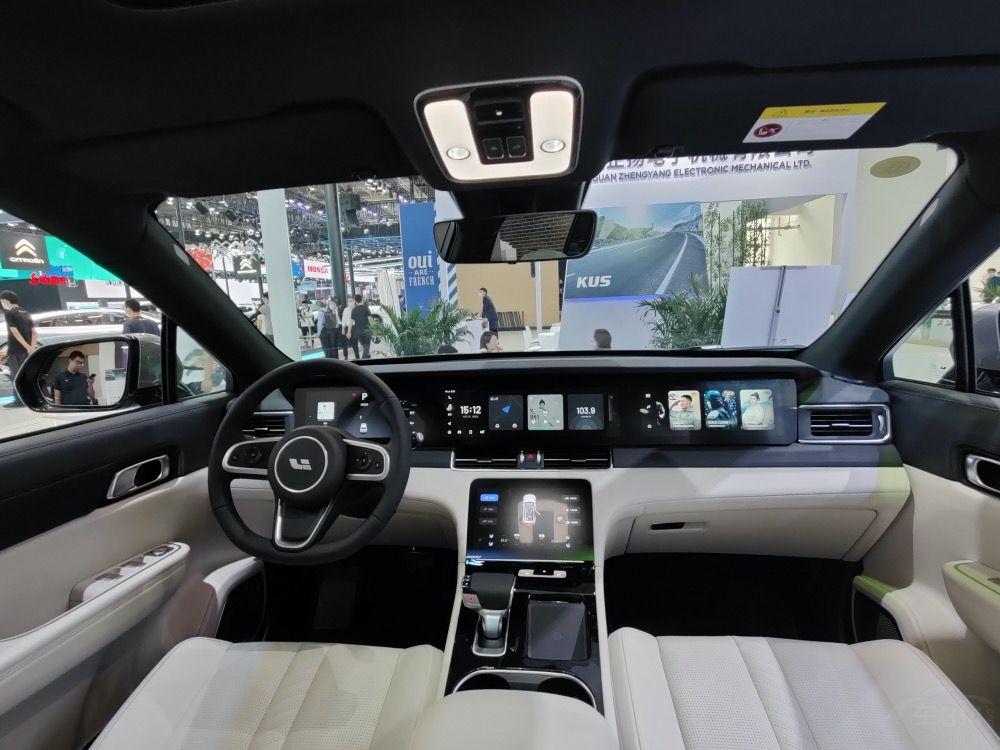 内饰看它的设计是十分吸睛的,出现了四块大屏相当科幻年轻,档次感也很强。不过这种简单衔接的组合方式还是有些呆板,如果换成曲面造型的话会有更好的驾驶沉浸感,年轻人也会更喜欢。