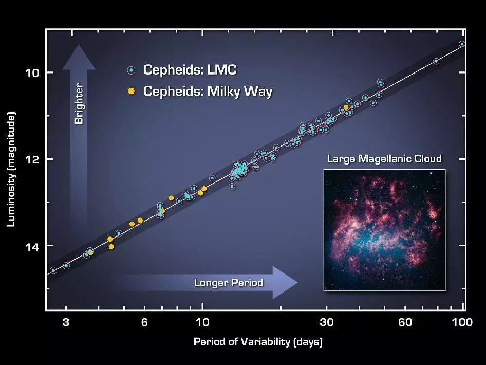 美国天文学家亨丽埃塔•莱维特(Henrietta Leavitt)研究了小麦哲伦星系中存在的造父变星的周期光度,这项研究有助于确定不断膨胀的宇宙中恒星间的距离。而这成了我们河外距离阶梯的第一梯级。