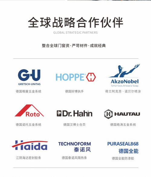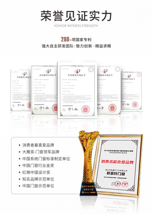 自成立以来,新豪轩门窗不断以颠覆性的产品,重新定义系统门窗美学。正是凭借着持续探索的品质、细腻打磨的匠心情怀以及高质量的产品与服务,新豪轩门窗在市场上收获了良好的口碑,荣膺“红棉中国设计奖”、“消费者最喜爱品牌”等200多项殊荣和280多项国家专利,并先后与德国HOPPE好博、德国G-U格屋、德国ROTO诺托、德国泰诺风、德国恩欣格等国际知名门窗配套品牌达成战略合作伙伴关系。