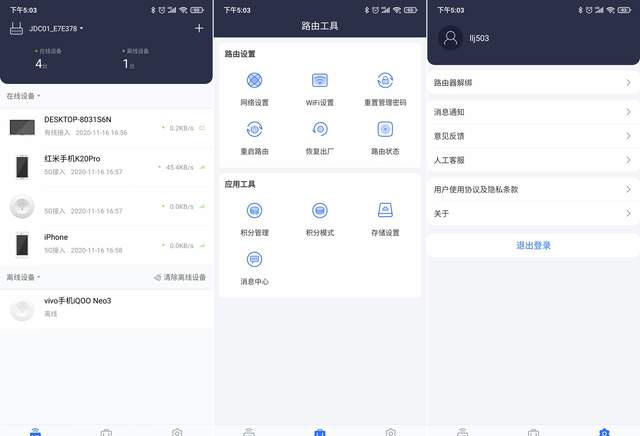 接着在手机上安装“京东云无线宝”APP,绑定路由后进入界面,可以看到该APP的界面简洁,分为路由、工具、设置三个板块,路由和设置不再赘述,主要讲讲路由工具,因为这里是赚积分的重点设置部位。