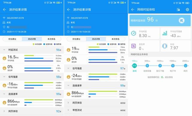 在手机上安装了WiFi测评大师,对这款路由进行多项测试,主要测试其稳定性和穿透性,在房间内不同的地方测试路由的平均信号强度、WiFi连接速率、网页加载速率、网页完全加载时间、下载速率、上传速率等,京东云无线宝·360WiFi全屋路由均表现出色。当然,我也测试了《王者荣耀》等手游,延迟一般在30ms左右,再也没有以前老路由经常460被队友举报的尴尬局面了,