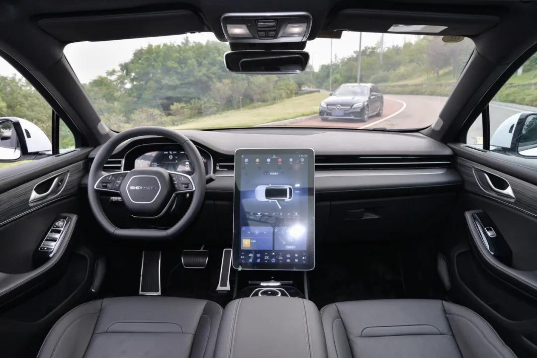 车内设计简洁大气,12.3英寸全液晶仪表+17英寸纵向中控液晶屏是内饰最突出的特点,中控面板整合了车内大多数控制功能,同时表现出更高水准的智能化和自动化,一键启动功能变成了全自动启停,同时车内的一切功能都可以通过SERES智能网联的人机交互和智能语音控制系统进行控制。