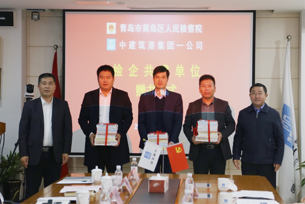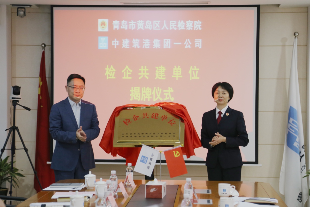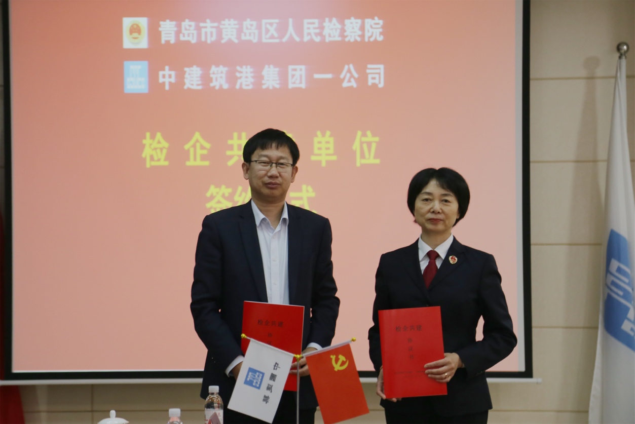 会上,中建筑港一公司书记、总经理张永敏介绍了公司概况、党建工作及廉政建设等情况。黄岛区人民检察院代表宣读了检企共建实施方案,检企双方共同作廉政从业承诺,共同签署检企共建协议书,黄岛区人民检察院党组副书记、副检察长杨翠华和中建筑港集团党委副书记、纪委书记、工会主席于建勇共同为“检企共建单位”揭牌。仪式中,该院向企业赠送40余本廉政书籍。