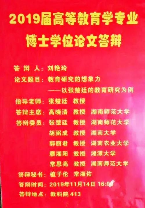 “神论文”丑闻尚未平息,马上又有网民曝光一则“神答辩”怪事。网传一张湖南师范大学2019年11月举行的博士论文《教育研究的想象力——以张楚廷的教育研究为例》答辩海报,奇怪的是,张楚廷既是被研究对象,又是作者导师,还是答辩委员,由此引发了网民对于“导师指导学生研究自己还亲自审查自己指导的研究自己的结果能不能答辩过关”是否合理的质疑。我们用“张楚廷”作为关键词对中国知网进行“篇关摘”检索,可检得论文254篇,其中学位论文24篇(博士论文9篇,全部出自湖南师大;硕士论文15篇,10篇出自湖南师大),学术期刊论文194篇,产量最高的作者如蒋己兰11篇、黎利云10篇、姚晓峰10篇全部毕业自湖南师大,而蒋己兰的导师正是张楚廷。