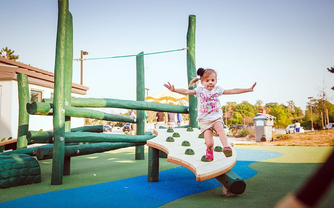 例如,学龄前儿童的空间具有较小的滑梯,秋千和感觉墙,而离湖最近的区域是为年龄较大的儿童设计的,具有精心设计的绳索和木板攀爬结构以及跳板平衡平台。